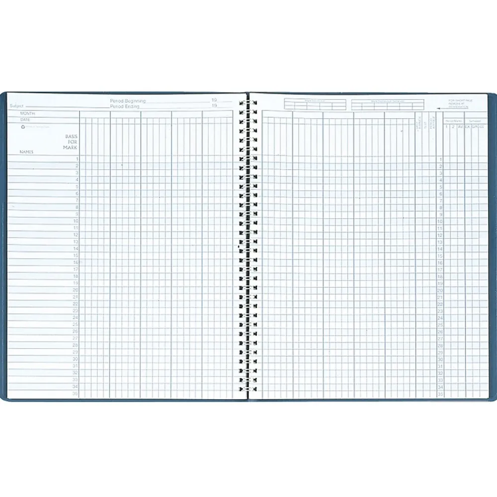 Handy teacher’s helper for the professional teacher or home school. Designed for a 9-10 week grading period with 40 weeks of school and 8 classes per year. Features large squares and provides space for 35 students. Includes seating charts, parent meeting log, substitute teacher page, important dates, class names, note pages, and student information pages. Durable blue embossed simulated leather cover will endure frequent daily use and strong wire binding firmly keeps the planner intact throughout the year. Printed on 100% post-consumer recycled FSC certified paper with soy inks. The wire is 90% recycled and our book covers are 50% recycled. Made in the USA. Measures 8-1/2″ x 11″. Sold as a pack of 2 record books.