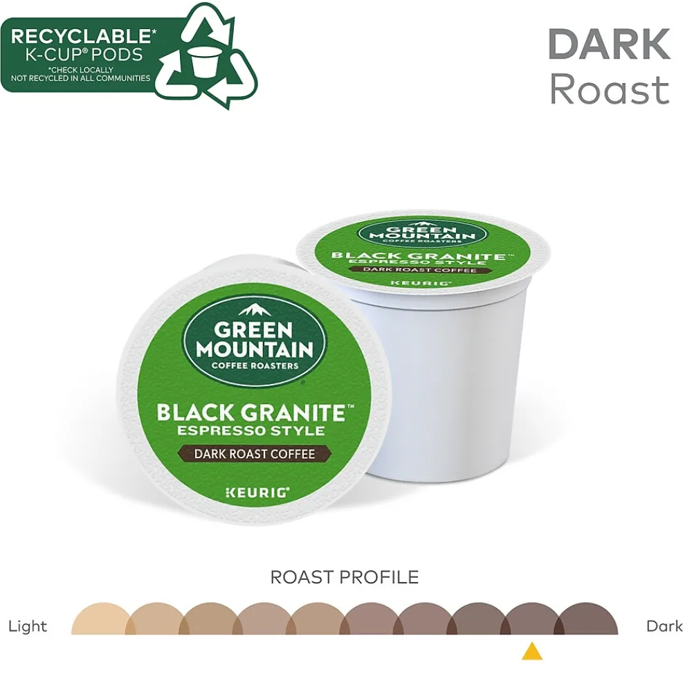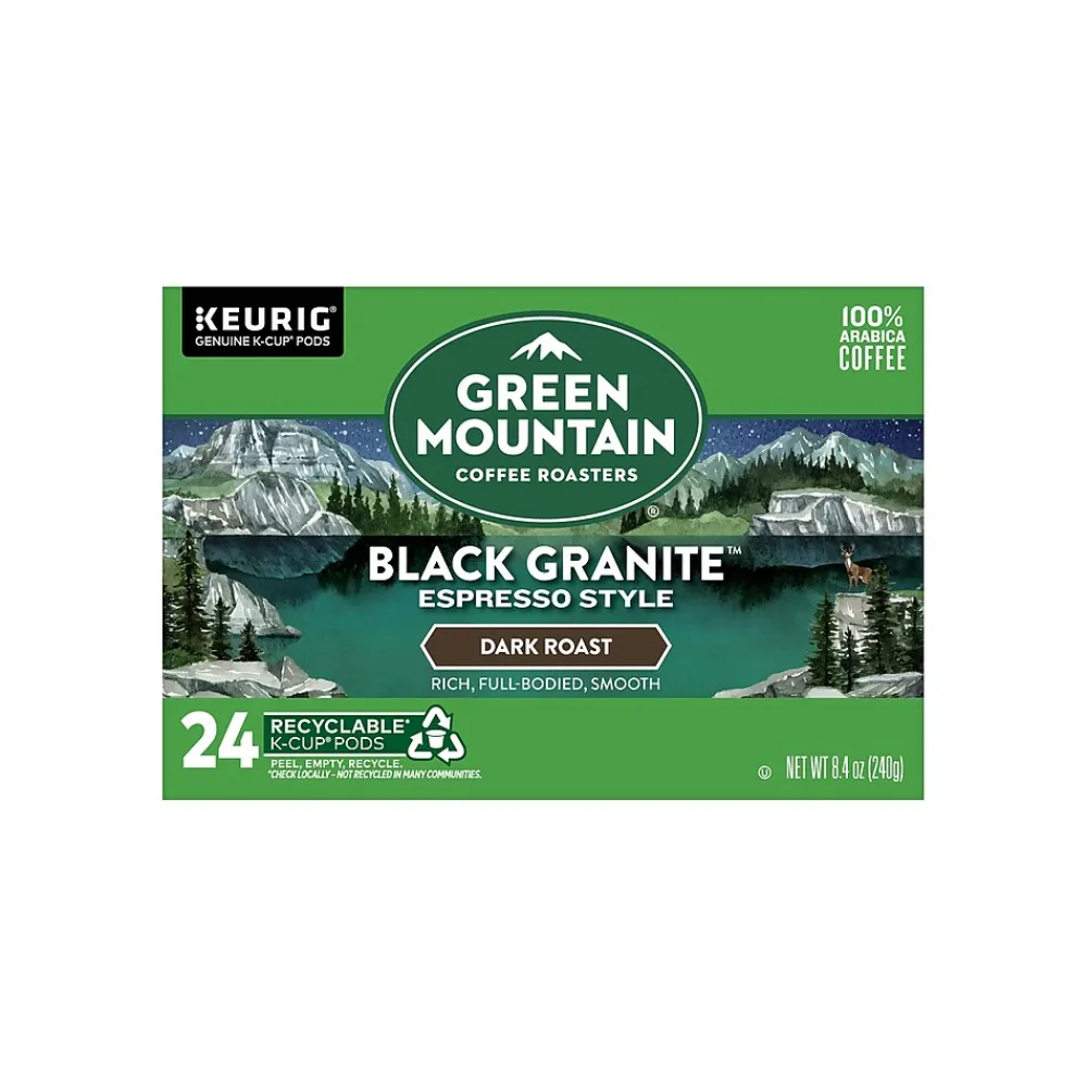 Take to the mountains from the comfort of your kitchen with Green Mountain Black Granite Espresso Style. Rich and full-bodied, with sweet, smoky notes unifying the flavors of dried fruit and toasted nuts, this espresso-style coffee is as powerfully strong, profoundly smooth, and distinctively dark as the name implies. Each sip is an exploration of expertly crafted beans, roasted to perfection. This single-serve K-Cup pod is filled with freshly ground, 100% responsibly sourced 100% arabica beans ready for your Keurig single-serve K-Cup pod coffee maker. Plus, the pod is recyclable. The Green Mountain Black Granite Espresso Style dark roast is the flavorful escape you’ll enjoy with peace of mind, time and time again. Green Mountain is driven to bring the world a richer, better cup of coffee. From the genuine K-Cup pods, optimally designed to deliver an elevated coffee experience at the press of a button, to your favorite awaiting coffee mug, cheers to the adventure of what’s next. Be bold. Be alive. Grab a cup and get out there.