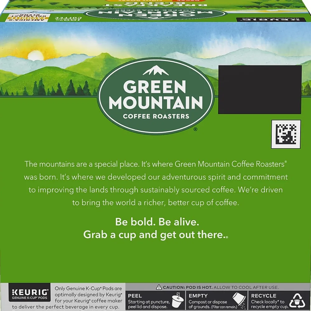 The mountains are a special place. It’s where Green Mountain was born. It’s where this adventurous spirit and commitment to improving the lands through sustainably sourced coffee was developed. Green Mountain is driven to bring the world a richer, better cup of coffee. Be bold. Be alive. Grab a cup, and get out there. The Green Mountain Breakfast Blend is as eye-opening and delightful as the dawn itself. Clean and bright, with balanced sweetness, nutty flavor, and a silky mouthfeel. Made with 100% arabica coffee. This single-serve K-Cup pod is compatible with all Keurig K-Cup pod single-serve coffee makers. This K-Cup pod is filled with the freshest ground coffee and brews a perfect, great-tasting cup of coffee every time. Certified Orthodox Union Kosher. What does being 100% responsibly sourced coffee mean? Responsibly sourced means the coffee is grown and sold in adherence to a credible sourcing program that aligns with Green Mountain’s responsible sourcing guidelines. This coffee is 100% responsibly sourced. Introducing recyclable K-Cup pods: simple, delicious, and now recyclable. Enjoy the same great-tasting coffee you know and love, and when you’re done, just peel, empty, and recycle.