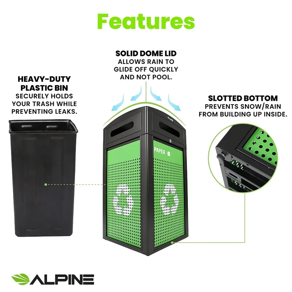 When equipping your business’s exterior with waste receptacles, you want to be reassured that it will last in the harshest weather conditions but is also aesthetically pleasing. With our 40-gallon all-weather recycling bin, you can check off both qualities. Our receptacle features a prominent white recycling symbol on the panels, a large section to display the included stickers and paper slot opening to dispose of all kinds of paper and wrappers properly. Its weather-resistant powder-coated steel frame and lid will ensure its longevity while maintaining its quality. Additionally, its solid dome lids allows rain to glide off quickly and not pool, decreasing the likelihood of corrosion. The included heavy-duty plastic interior bins will securely hold trash bags without worrying about leaks. Since your terrain isn’t always guaranteed to be perfectly flat, we have outfitted our trash container with adjustable legs. They will help certify stability and support on uneven surfaces. The Alpine recycle outdoor receptacle is vital to keeping your facilities clean and elevating your aesthetic. We understand that sometimes things happen, such as theft or vandalism; therefore, we’ve equipped each trash container with a lock and key to help protect your investment. Includes two chain-link security chains that prevent your lid from falling when opened.