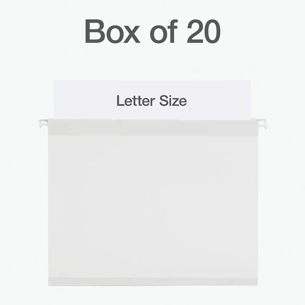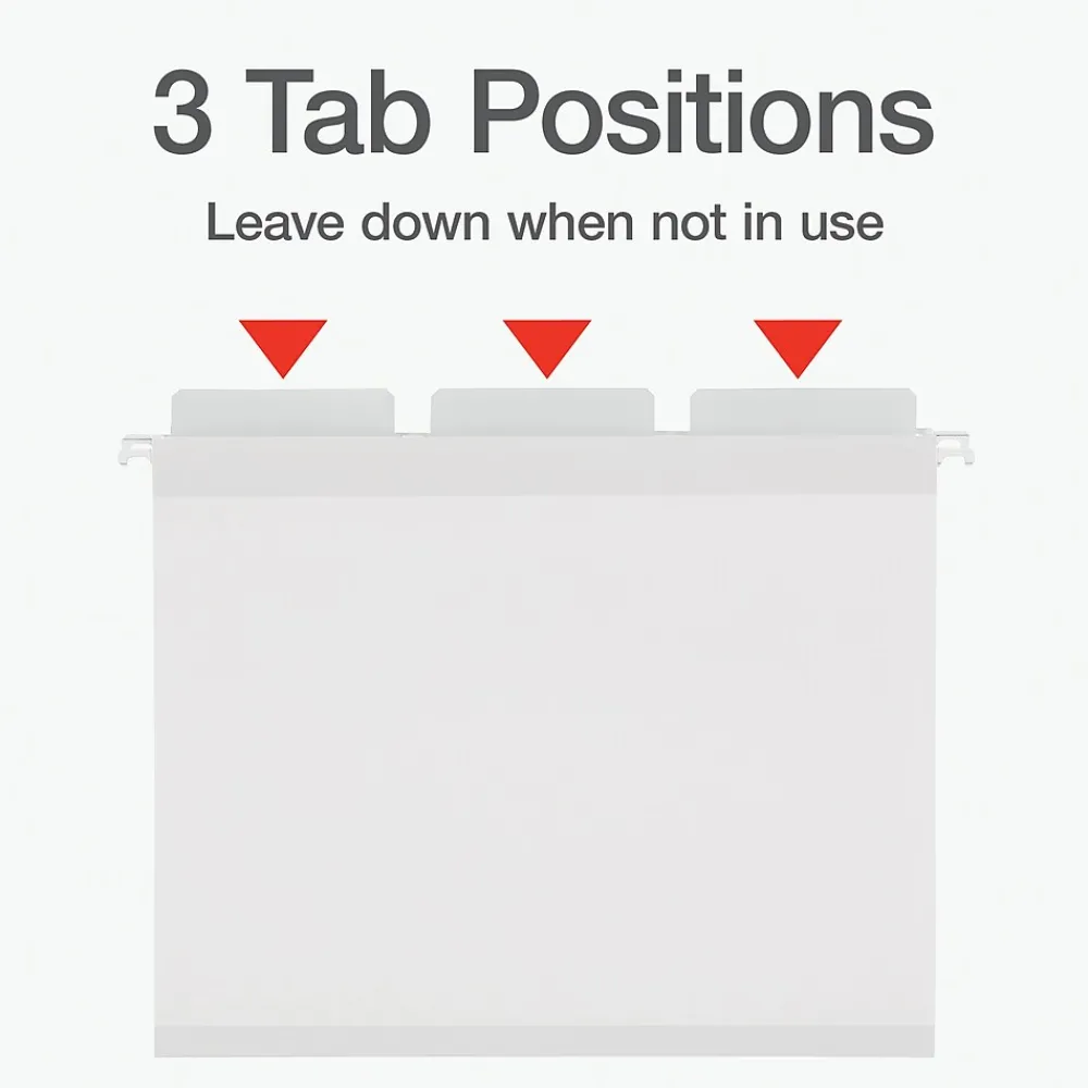 These Ready-Tab Reinforced Hanging File Folders have built-in tabs you can just lift and use. Poly strips at the top and bottom edges protect against rips and tears. They have large 1/3 cut tabs and include a printable sticker label sheet. You can also write on the tabs with a permanent marker. They fit standard, letter size 8.5″ x 11″ documents. Box of 20 white hanging file folders.