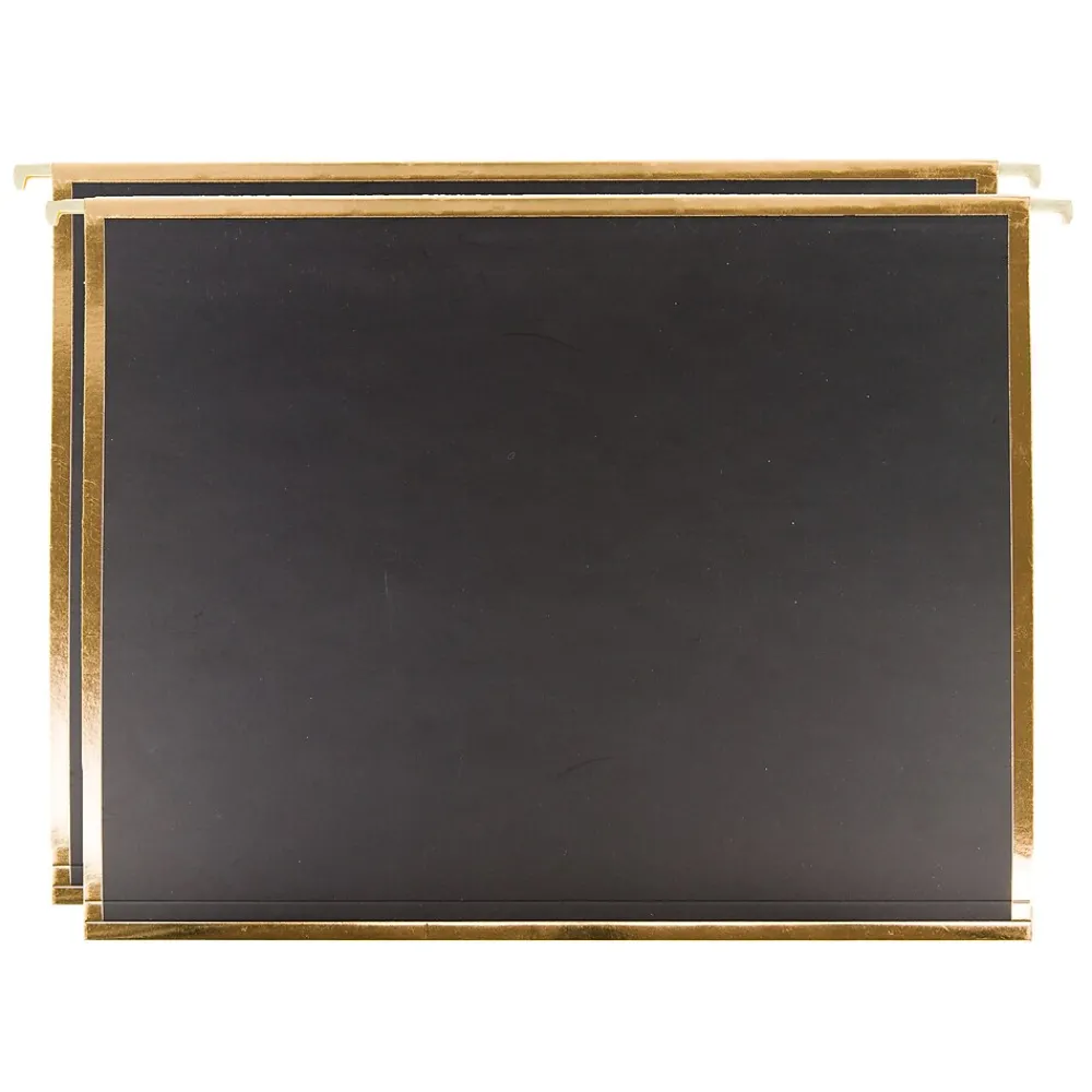- Assorted hanging file folders come in black, white and pink with a gold border