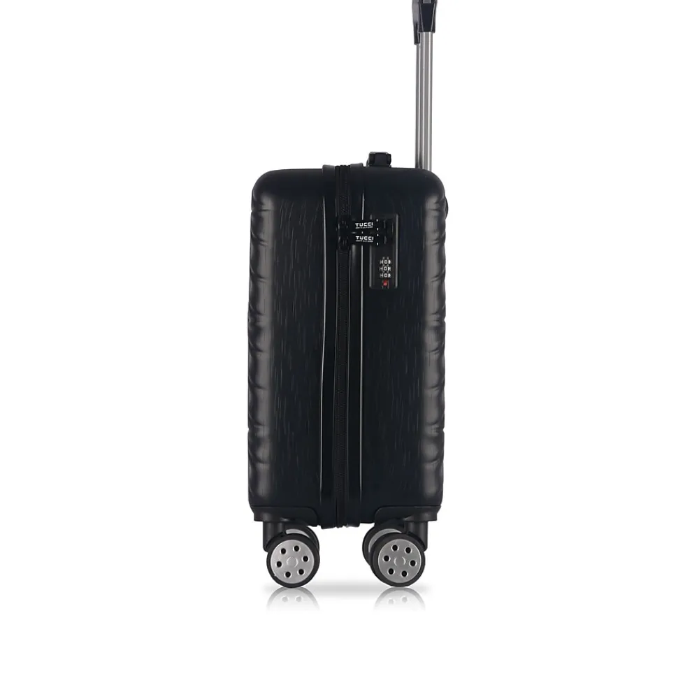 The Tucci Storta 1PC Carry-On in Black (T0476-17in-BLK) is designed for travelers who prioritize both style and convenience. This sleek 17-inch carry-on features a matte black finish, offering a modern and refined look. Crafted from lightweight yet durable, scratch-resistant materials, it is built to withstand the demands of frequent travel. The carry-on is equipped with 360-degree spinner wheels and a telescoping handle for smooth maneuverability through airports and busy streets.