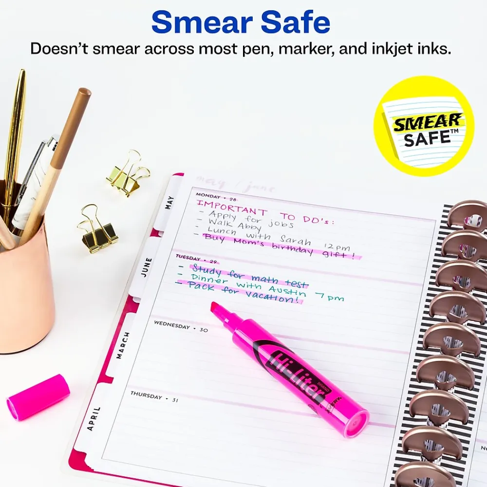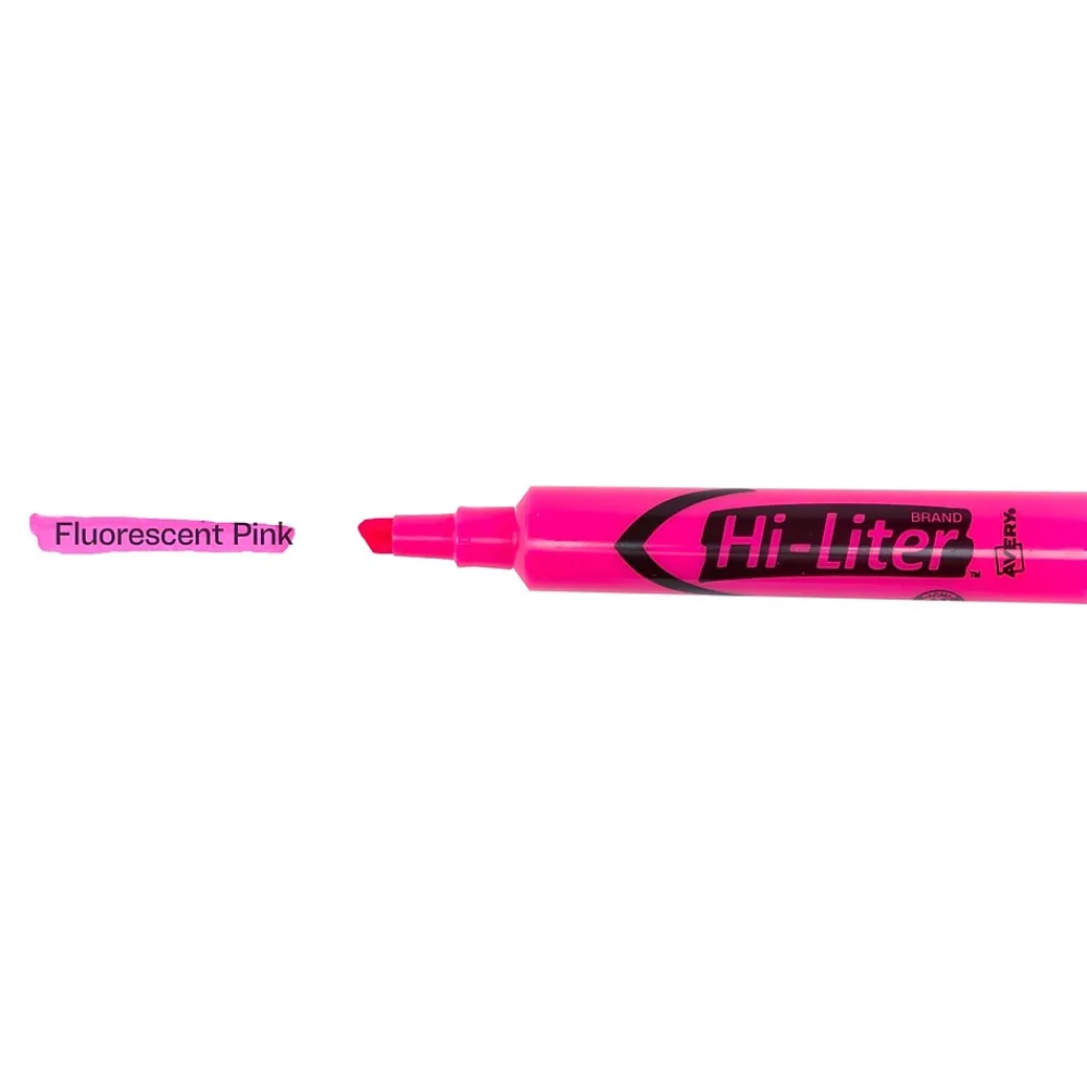 Prepare notes, research materials or index cards with these desk-style highlighters. The nontoxic ink is ideal for use in both offices and classrooms, while the fluorescent pink color stands out for better visibility. These Avery Hi-Liter chisel-tip highlighters resist smearing and smudging to keep papers clean.
