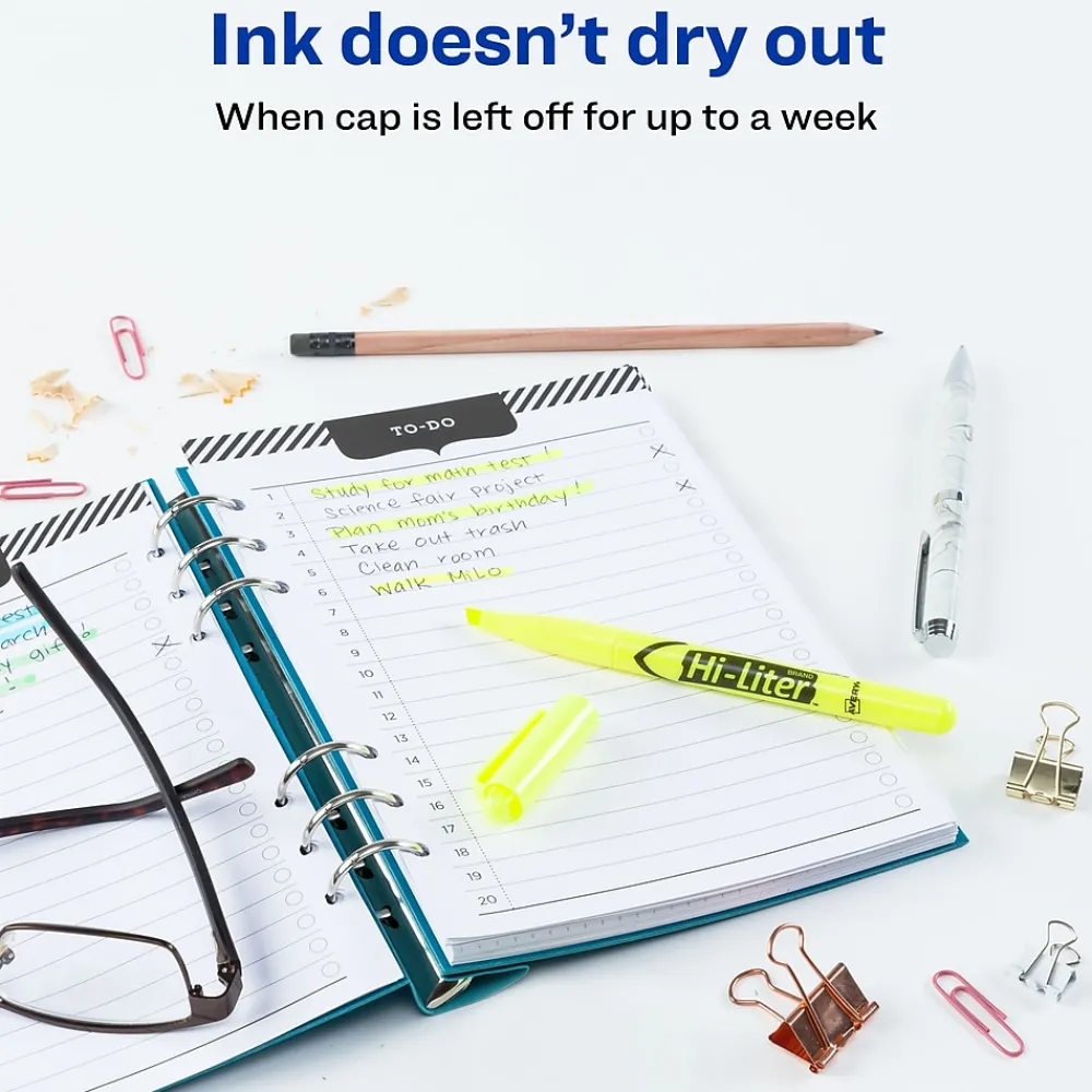 Use these fluorescent yellow chisel-tip pen-style highlighters to make key points stand out. These Avery Hi-Liter fluorescent yellow highlighters feature a chisel-tip design that lets you create thin and thick lines depending on the angle for underlining or highlighting important text.