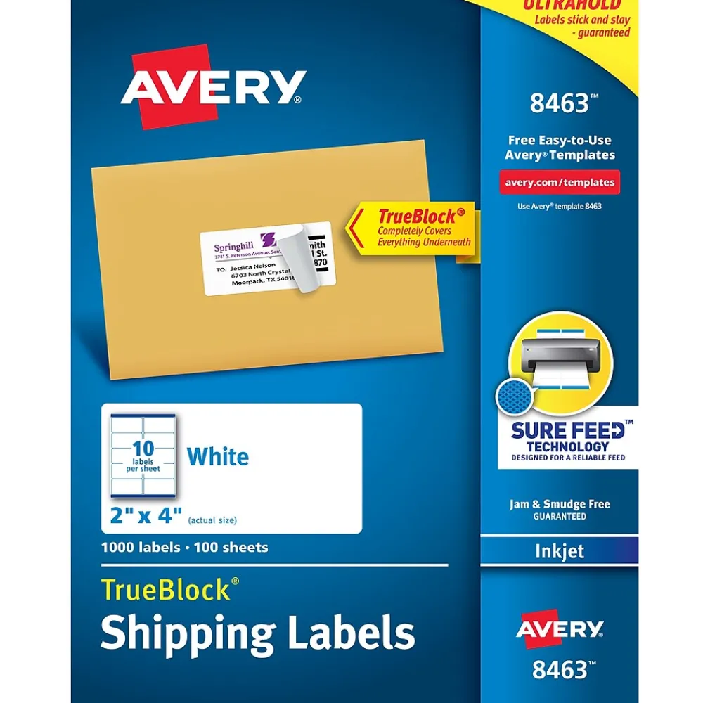 Stock up the mailing room or office with these white inkjet shipping labels. The TrueBlock feature prevents text and images beneath the label from showing through, and with 1000 labels, each box makes it easy to take on high-volume mailing tasks. Free templates from Avery Design & Print let you print custom text and images onto these Avery TrueBlock white shipping labels. These printable labels feature Sure Feed technology, designed for a reliable feed through your inkjet printer, preventing misalignments and jams.