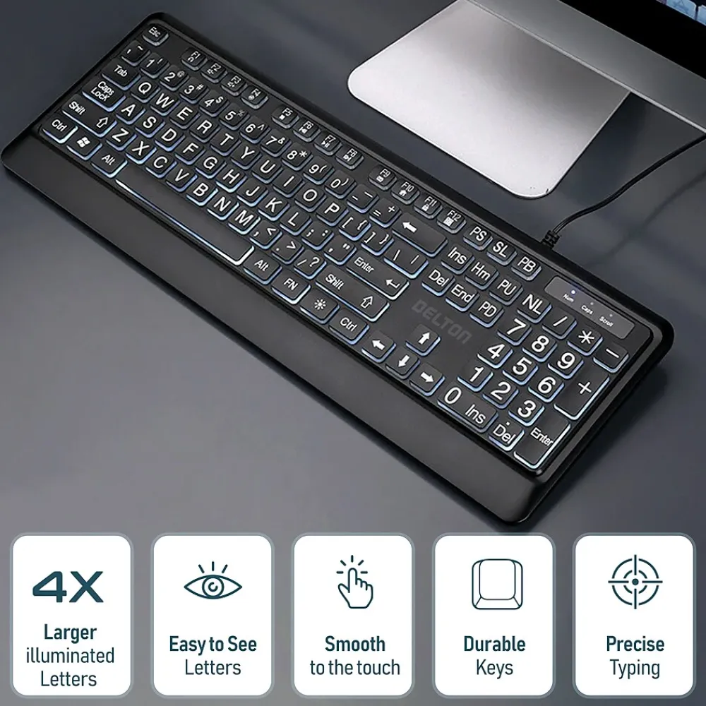 Elevate your typing experience with the Delton KB20 portable keyboard. Built for those who demand clarity and comfort, this backlit keyboard boasts large-print buttons and subtle backlighting, making it perfect for users with low eyesight or seniors seeking ease of use. Whether you’re typing during the day or in low-light conditions, the oversize characters and backlighting ensure excellent visibility at all times. The full-size layout, including a convenient numeric keypad, is complemented by dedicated multimedia keys, streamlining your control over volume and more with a single touch. Engineered to reduce fatigue through thoughtfully crafted keys, this computer keyboard invites you to enjoy extended typing sessions without discomfort. Quick access function keys enhance productivity, allowing for effortless adjustments and navigation. With clear Caps Lock and Num Lock indicators, you’ll avoid common typing errors, ensuring your work remains uninterrupted. Universal OS compatibility means seamless integration with your existing setup, whether you use a desktop PC or laptop.