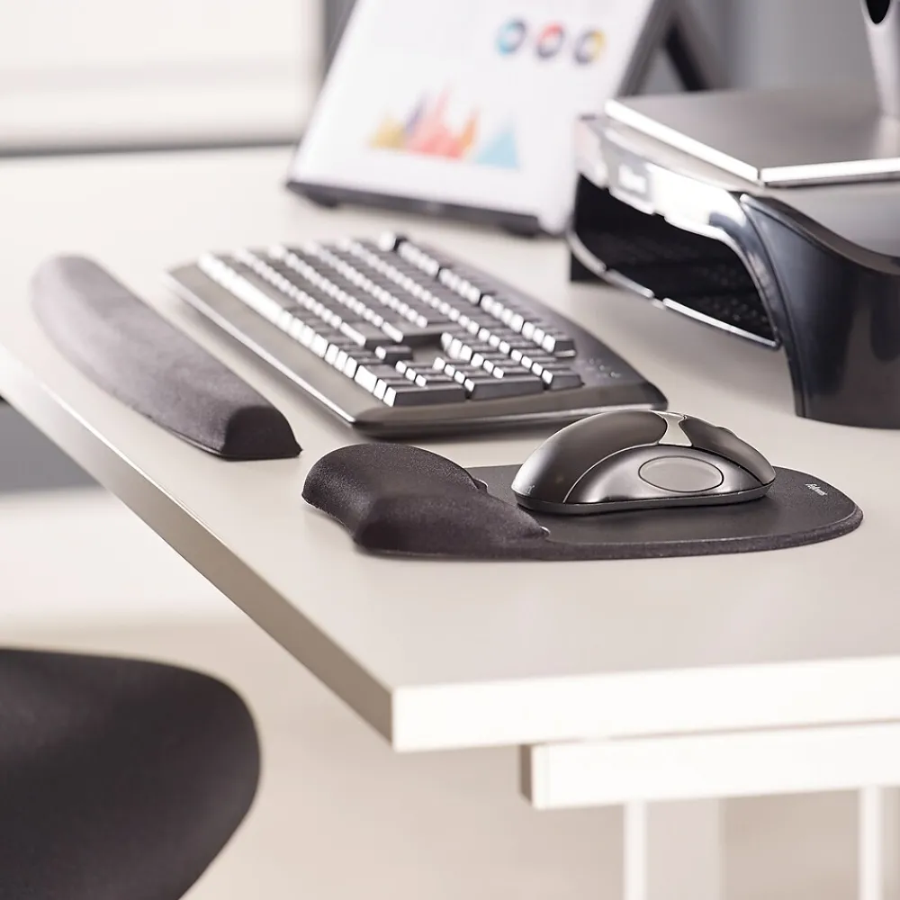 Position your wrist for comfort with this ergonomic memory foam keyboard pad. The soft cushioned pillow offers a plush feel, while the double jersey covering withstands regular wear and tear. A non-skid base prevents slipping to keep this pad securely in place on your desk or table. This Fellowes black wrist rest 9178201 keeps its shape even with daily use for added resiliency.