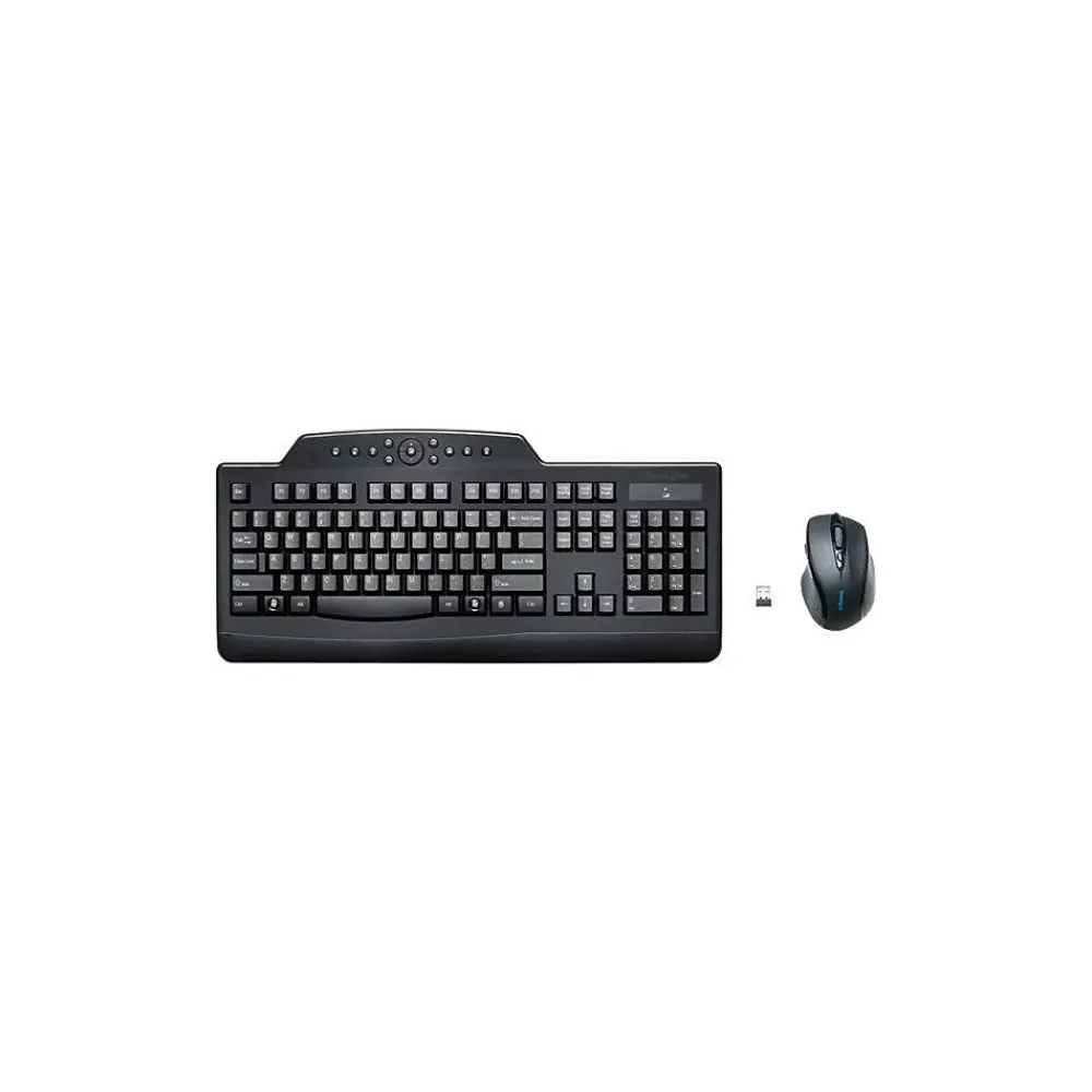 KensingtonĀ® Pro FitĀ® Media desktop set comes with height adjustable keyboard and optical scroll wheel mouse for convenient typing/pointing. Set uses wireless RF technology and USB host interfacing port to make connection with computer.