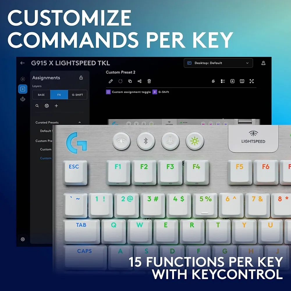 - The G915 X LIGHTSPEED TKL has a tenkeyless design, which means it doesn’t include a numeric keypad. This makes it more compact. It features 87 keys in total and a set of function keys (F1 through F12) which you can customize via Logitech G HUB software to suit your needs. What’s more, you can assign up to 15 functions per key with KEYCONTROL. That’s a lot of power at your fingertips.