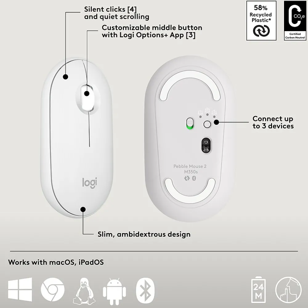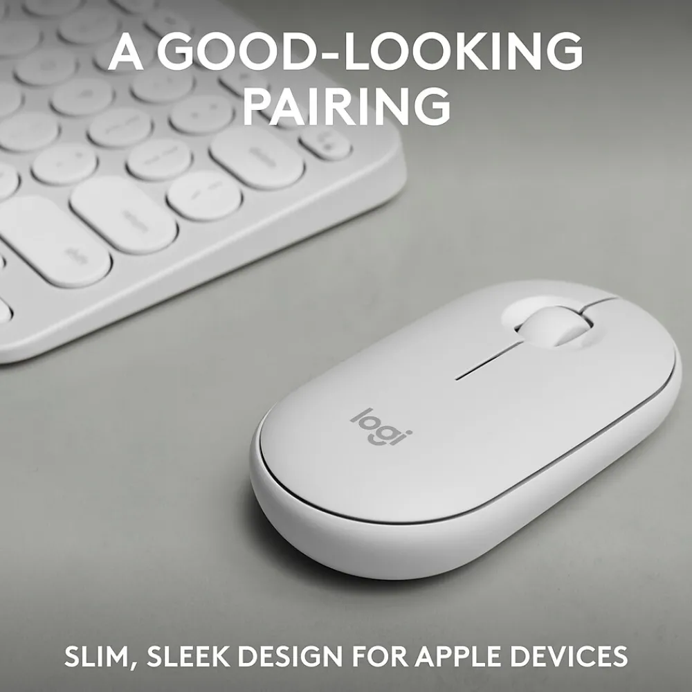 Logitech Pebble 2 slim, multi-device Bluetooth keyboard and mouse with customizable keys and button.