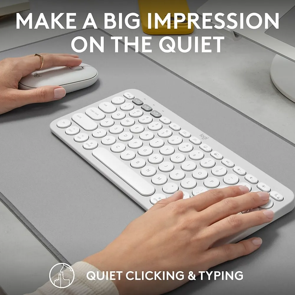 - Comfy and quiet laptop-like typing with scooped, low-profile keys
