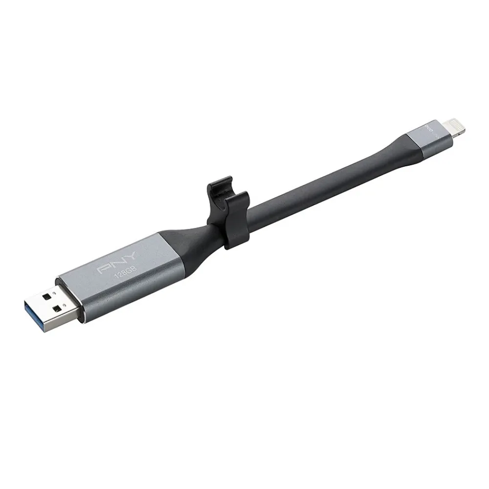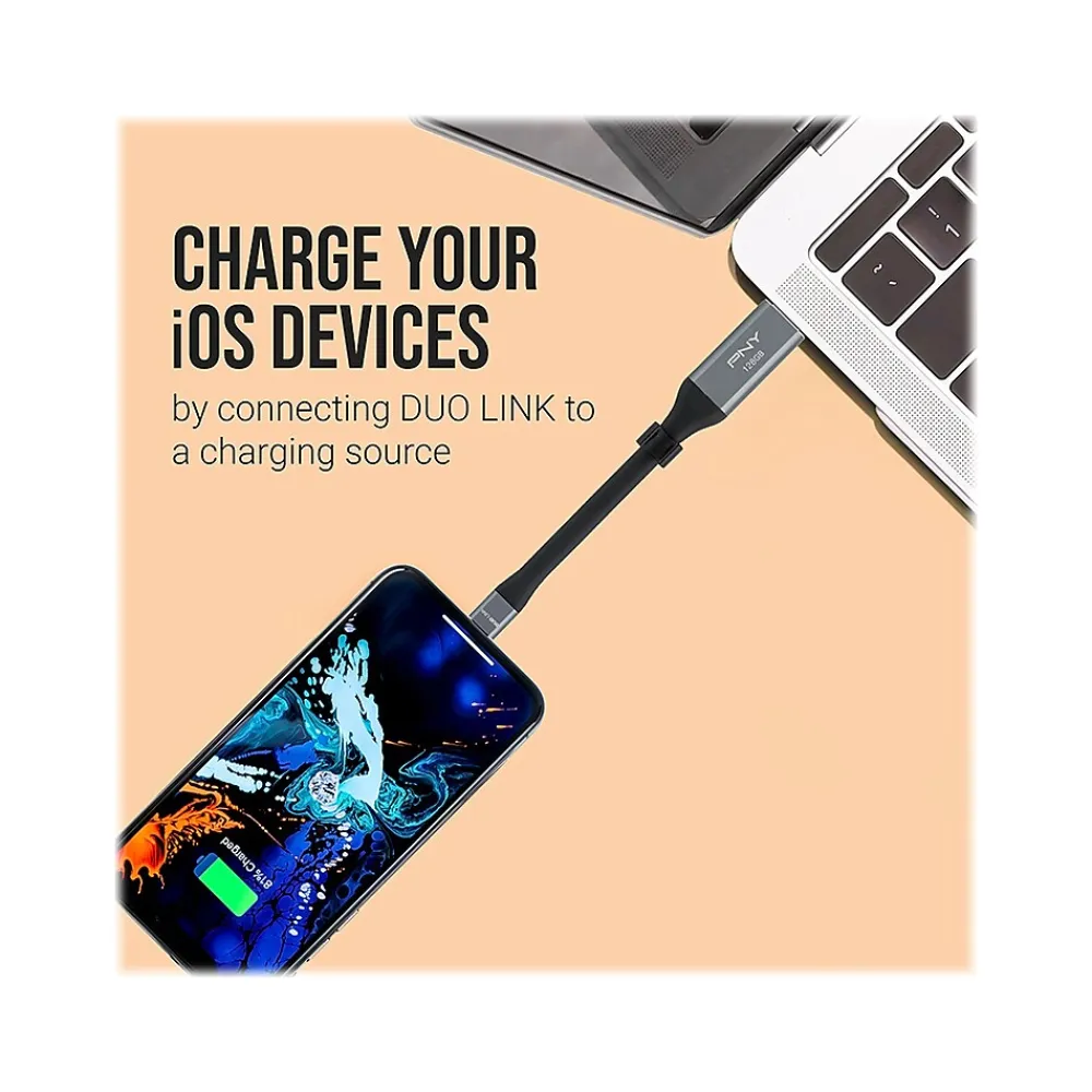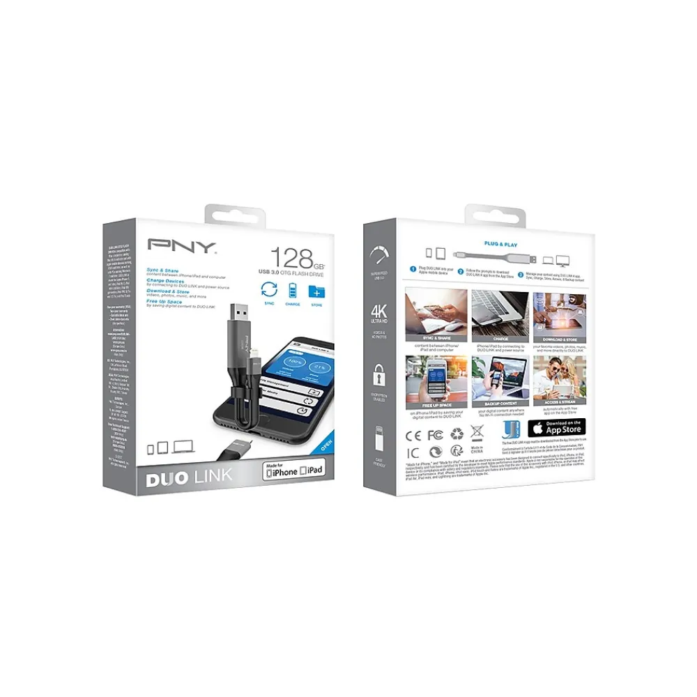 The PNY DUO LINK 128GB USB 3.0 OTG flash drive enables you to free up space on your iPhone and iPad, sync and share content between devices, back up contacts, download and store videos, photos, and more via the free, easy-to-use app while simultaneously charging your iOS devices.