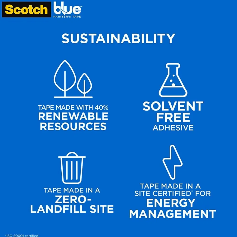 - SUSTAINABILITY: Made from 40% renewable resources; Solvent-free Adhesive; Tape made in a zero-landfill site certified for energy management (ISO 50001 certified), Core made with 70% post-consumer waste