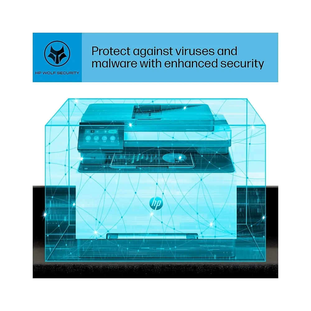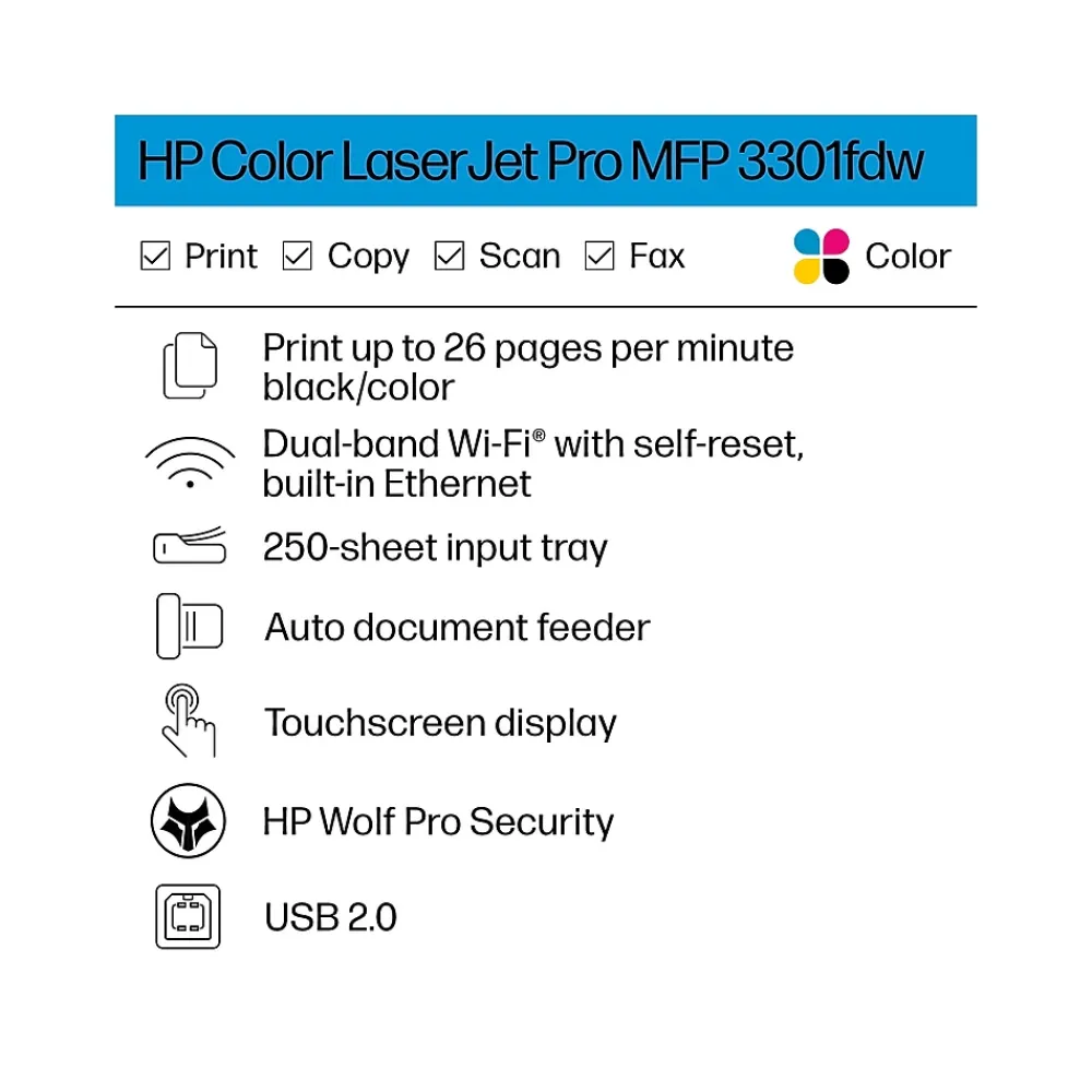 Ideal for offices, get vibrant laser-quality color and powerful productivity with the Color LaserJet Pro MFP 3301fdw. This all-in-one color laser printer is loaded with features and incredible speed perfect for offices. Print, scan and copy from anywhere with HP app. Connect via wireless or ethernet with the 3301fdw, an mfp that has built-in Wi-FiĀ® and HP Wolf Pro to keep your information secure.