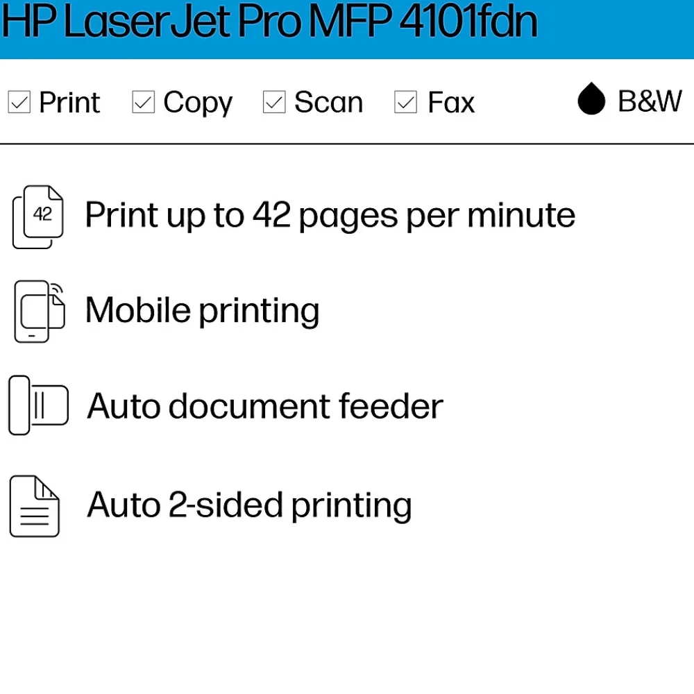 The LaserJet Pro MFP 4101fdn all-in-one printer delivers laser quality black & white printing, scanning, copying and fax for all your business needs. Get blazing fast speeds, auto 2-sided printing, an automatic document feeder, and powerful productivity with advanced features for small teams. Share among users on your office network with wired ethernet connectivity.