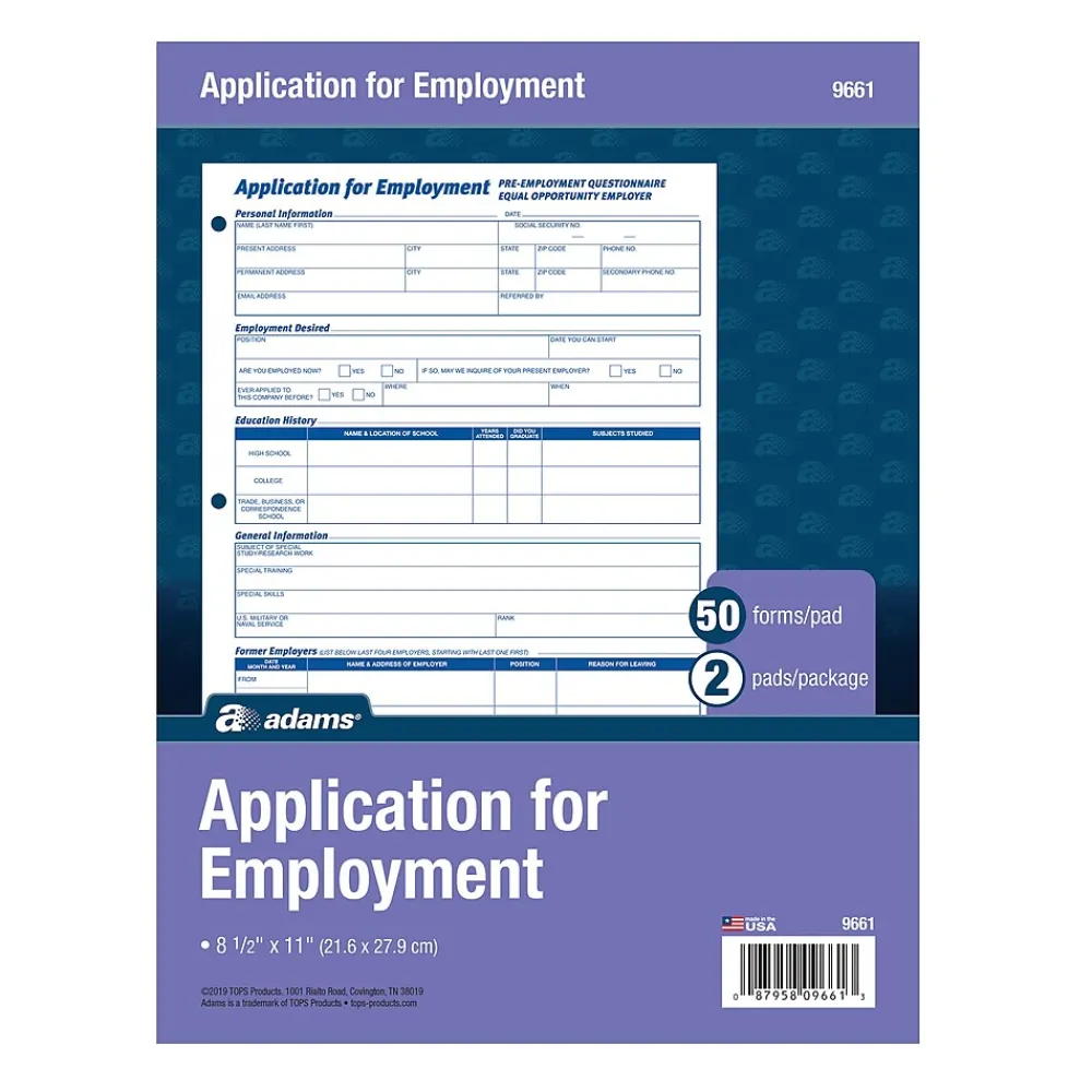 Make applying for employment simple by using these letter-size employment application forms. Each one is printed in English for convenience, while the three-hole-punched edge lets you conveniently insert them into any standard three-ring binder. These Adams employment application forms comply with all legal requirements and have 50 sheets per pad, so stocking up is easy.