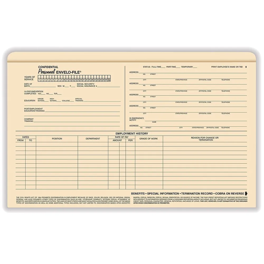 Even in today’s digital work environment, maintaining original employee records is necessary. The legal-size ComplyRight Confidential Personnel Envelo-File is ideal for safely storing employment applications, evaluation forms, warning notices and other employee paperwork. The smart design also allows you to record key information and benefits right on the folder, putting everything at your fingertips for greater convenience.