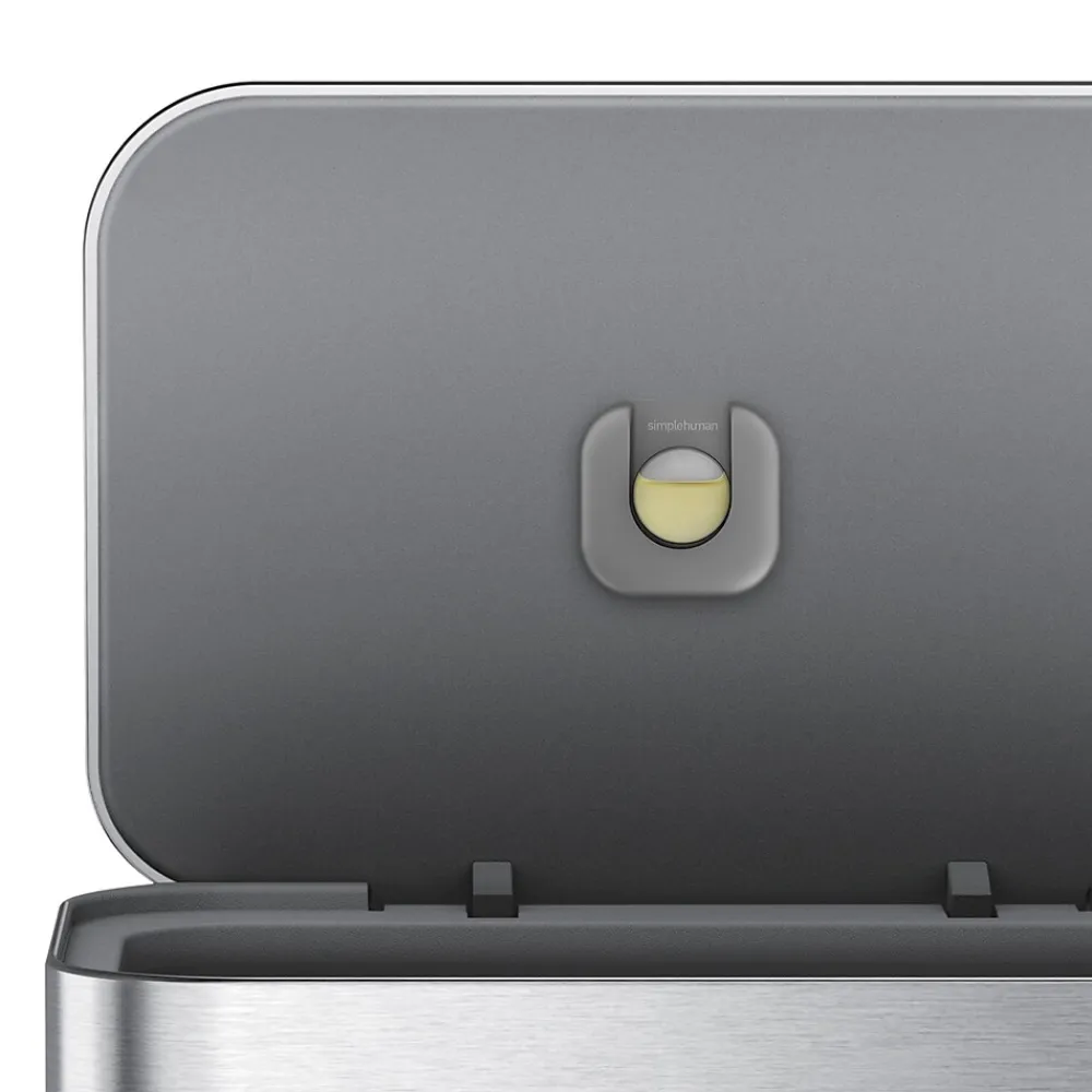 - Silent close lid – The simplehuman patented lid shox® technology controls the motion of the lid for a slow, silent close.