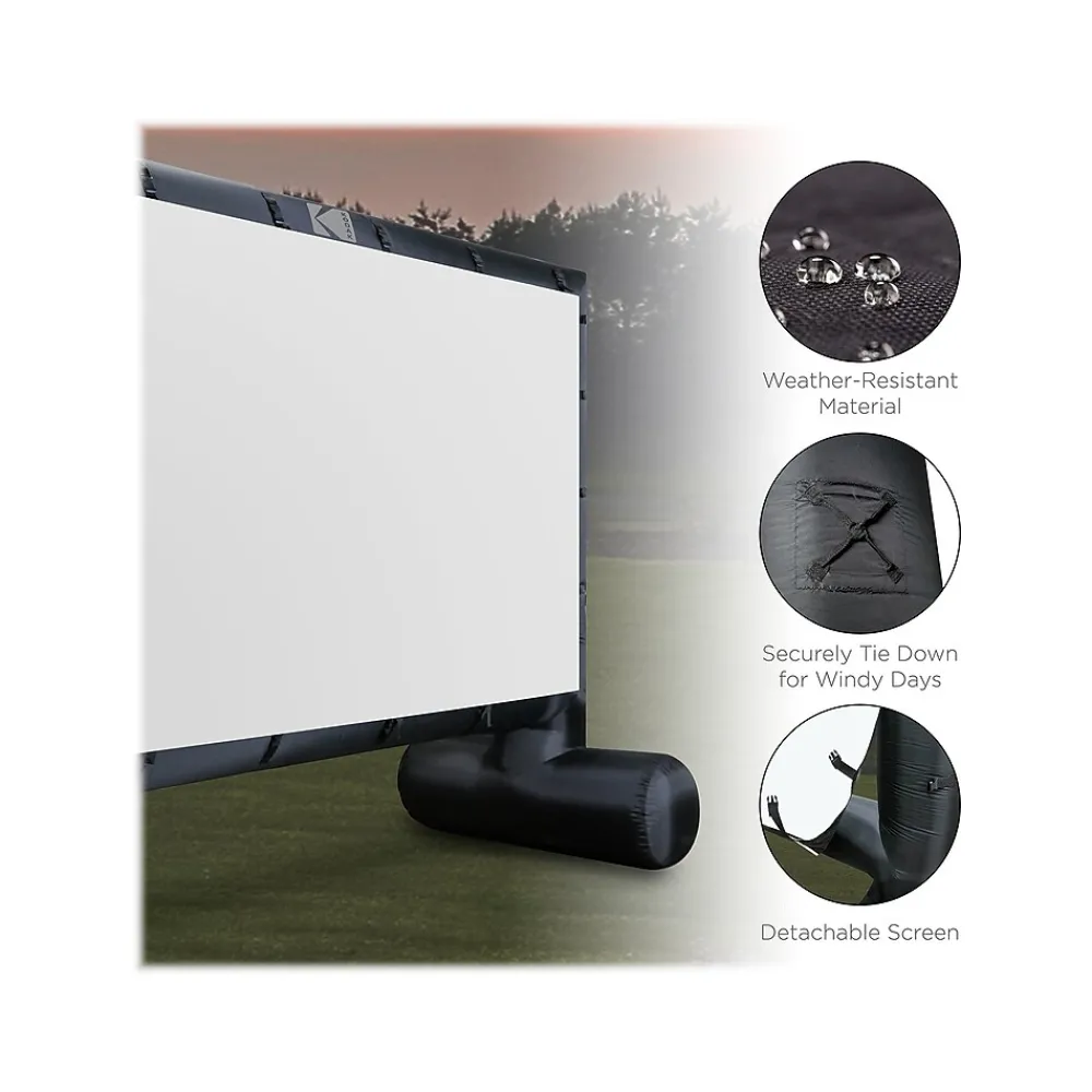 - Weather-resistant floor-standing inflatable projector screen brings movie magic for family gatherings, barbecues, birthday parties, and any other outdoor event