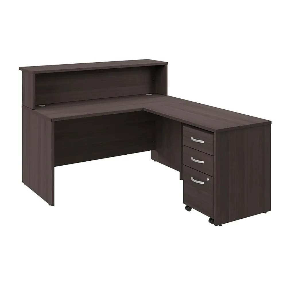 The Bush Business Furniture Arrive 60W x 72D L Shaped Reception Desk with Shelf and Mobile File Cabinet provides a stylish and practical solution for welcoming guests to your office’s waiting room. Greet clients, patients, and other visitors at a front desk that includes a raised shelf for signing in and completing paperwork. The durable thermally fused laminate surface protects against scratches and stains while a 200-pound weight capacity and built-in wire management grommets accommodate multiple monitors and other equipment. The rolling file cabinet features one drawer for letter, legal, and A4-size paperwork as well as two drawers for supplies. This commercial-grade L receptionist desk with drawers has been meticulously tested to meet or exceed ANSI/BIFMA standards for safety, durability, and performance and is backed by a 10 Year Warranty. American made with U.S. and imported parts.