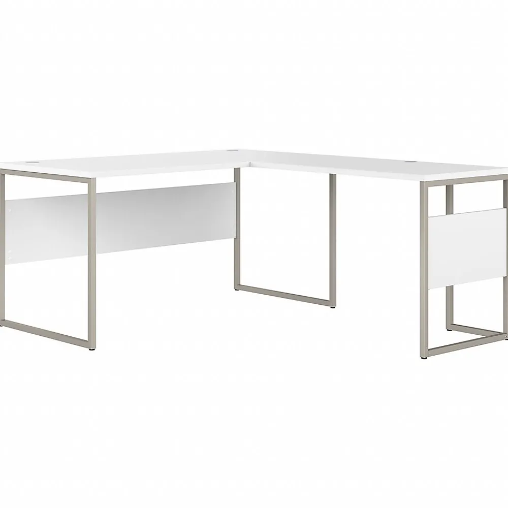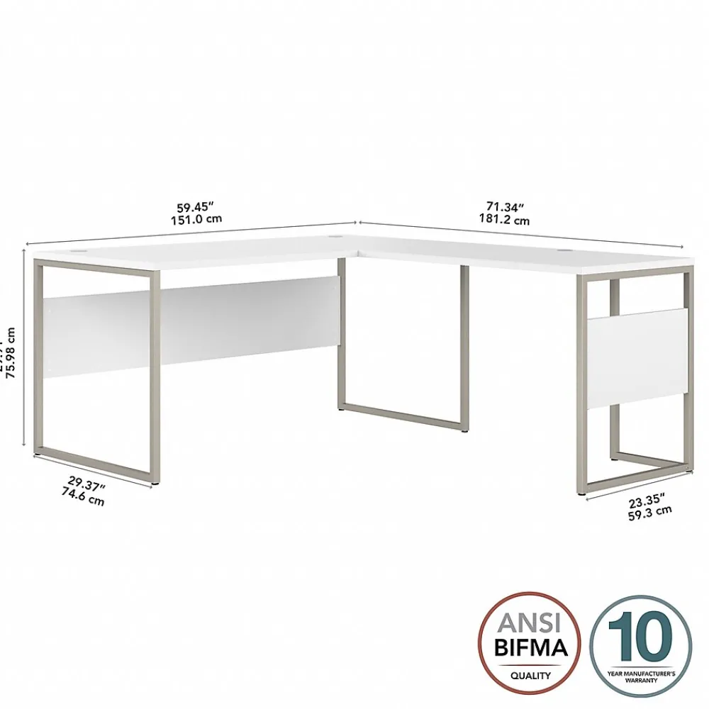 The Bush Business Furniture Hybrid L-shaped table desk blends a durable work surface with sturdy metal legs to offer a stylish, long-lasting solution for the modern professional. Tackle your next project or assignment with a computer, books, and more on a desktop that supports up to 200 lbs. Three built-in wire management grommets keep cords and cables in order, so your work area remains free from unnecessary clutter. The corner desk’s open leg design and finished privacy panel allows it to look great facing any direction in a home or professional office environment. This modern computer desk has been meticulously tested to meet or exceed the ANSI/BIFMA standards for safety, durability, and performance and is backed by a 10-year manufacturer warranty. American-made with US and imported parts.
