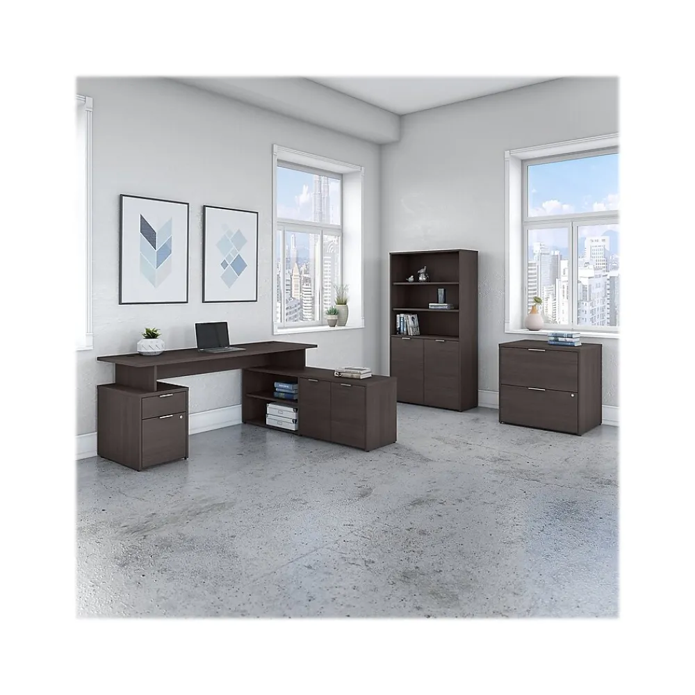 The Bush Business Furniture Jamestown 71″W L-shaped desk with lateral file cabinet and five-shelf bookcase are perfect for a large office or a remote workspace. With its contemporary style and adaptable modular design, this furniture set is built to meet the ever-changing demands of today’s workplace. The elevated 71″W x 24″D surface holds multiple monitors with a 200 lb. weight capacity. The desk is supported by a 59″W low storage return on the one side and a lockable two-drawer file cabinet on the other for convenient access to supplies. Additional legal-, letter-, and A4-size paperwork can be organized in the lateral file cabinet, which also locks to protect sensitive information. Two doors cover the bottom of the bookcase to conceal reference materials while leaving the top open for display. This L-desk with storage is tested to meet ANSI/BIFMA standards for safety and performance and is backed by a 10-year warranty. American-made with US and imported parts.