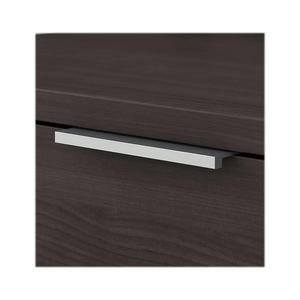 - Bundle includes: 71″W desk with two-drawer file cabinet and low storage return, two-drawer lateral file cabinet, and five-shelf bookcase