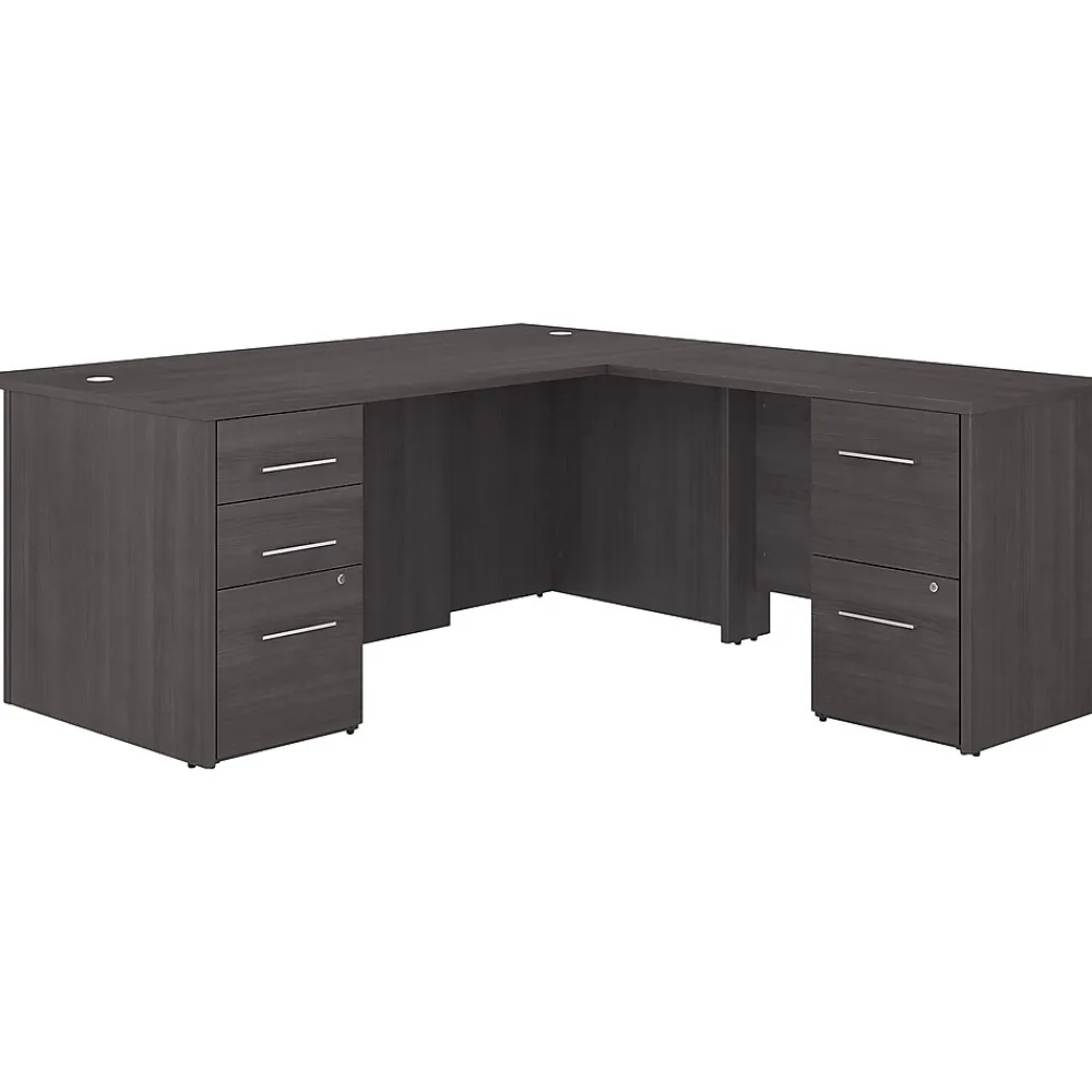 The Bush Business Furniture Office 500 71″W L-shaped executive desk with drawers provides a modern workspace with professional style and quality. Highlighted by its distinctive breakfront design, the Bush Business Furniture Office 500 71″W L-shaped executive desk with drawers presents a workspace that showcases the style and personality of the today’s professional. Take a prominent position in your private office as you get to work on a spacious right- or left-handed desktop with built-in wire management. This L-shaped computer desk supports multiple monitors and other equipment with a weight capacity of 200 lbs. Two file cabinets fit underneath the desk for easy access to legal-, letter-, and A4-size paperwork and supplies. All three file drawers and one of two box drawers can be locked to secure sensitive documents and personal items. This L-shaped desk with storage is tested to meet ANSI/BIFMA standards for safety and performance and is backed by a 10-year manufacturer limited warranty. American-made with US and imported parts.