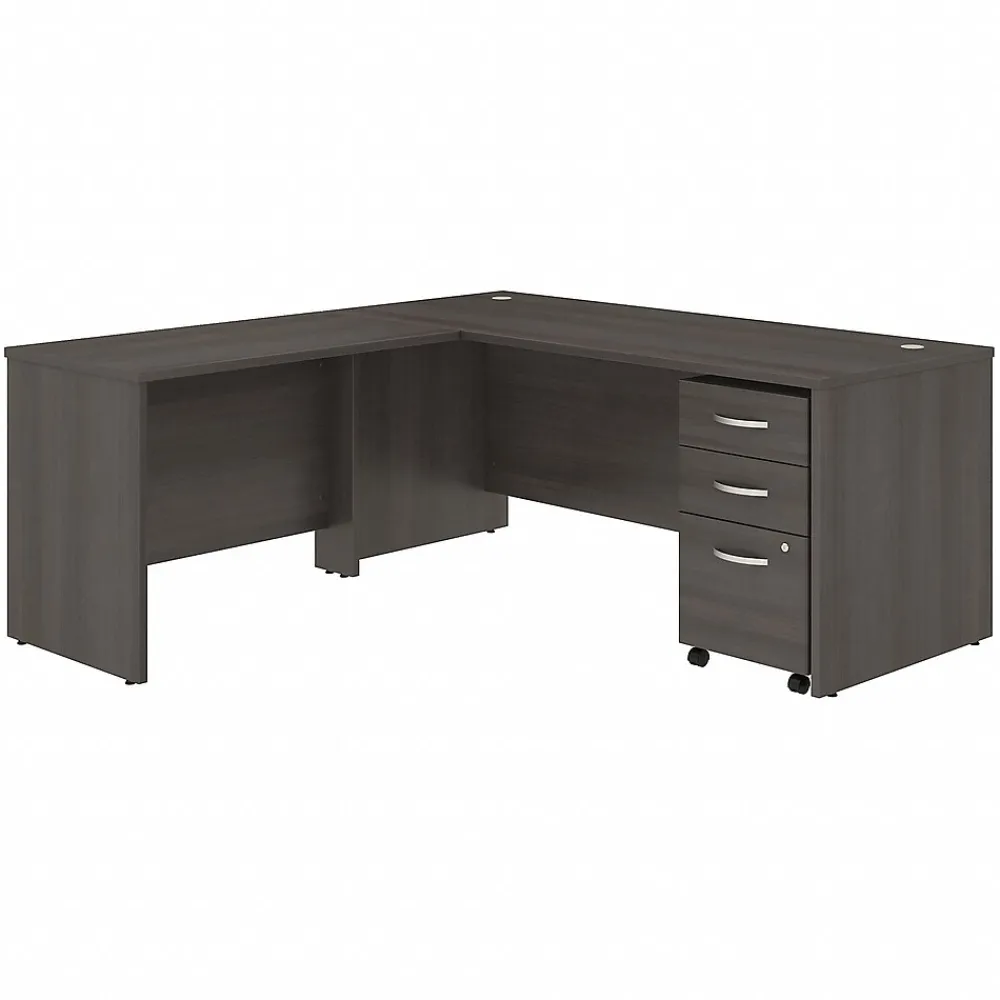 Choose this Bush Business Furniture Studio C L Shaped Desk for a comfortable design that works with you for years and a fresh finish that looks great anywhere. With a thick surface, an extended modesty panel and clean lines, the L Shaped Desk conveys a classic look but adds a contemporary White or Storm Gray finish to meet the style needs of the modern workspace. The thermally fused laminate finish, durable edge banding and sturdy end panels resist scratches, stains or dents while standing up to the rigors of a 40-plus hour work week. Keep pesky computer cords out of your way with the cable management system for an organized work surface. The 42W Return attaches to either side of the Desk to form a left or right handed L Shaped layout, while the 3 Drawer Mobile File Cabinet rolls with you throughout your office or remains in place as needed on any surface. This contemporary office furniture comes with a 10 Year Warranty and meets ANSI/BIFMA quality test standards. American made with U.S. and imported parts.