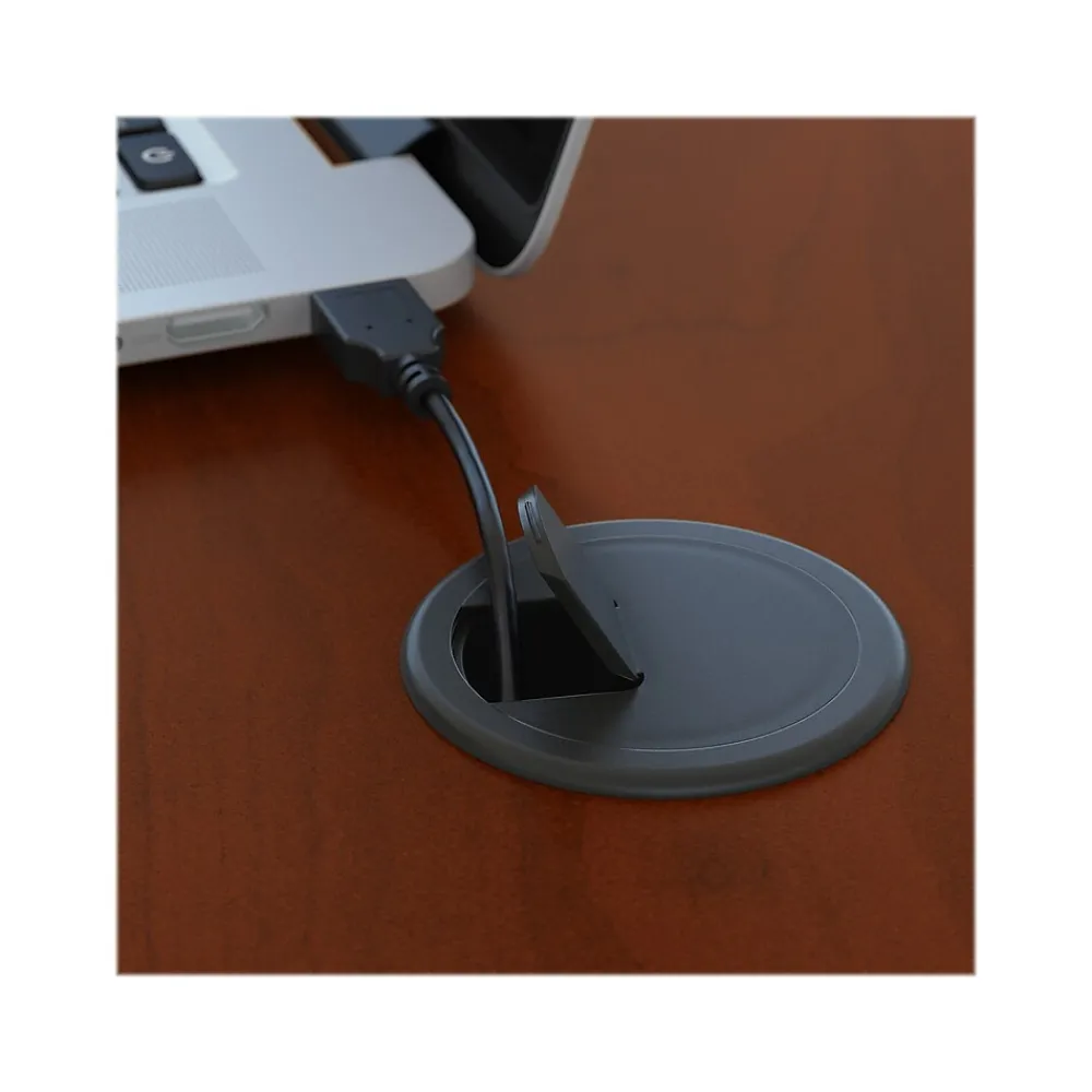 - Integrated wire management grommets control your cables, and an inviting bow front design gives guests the added space they need to pull up chairs for a meeting