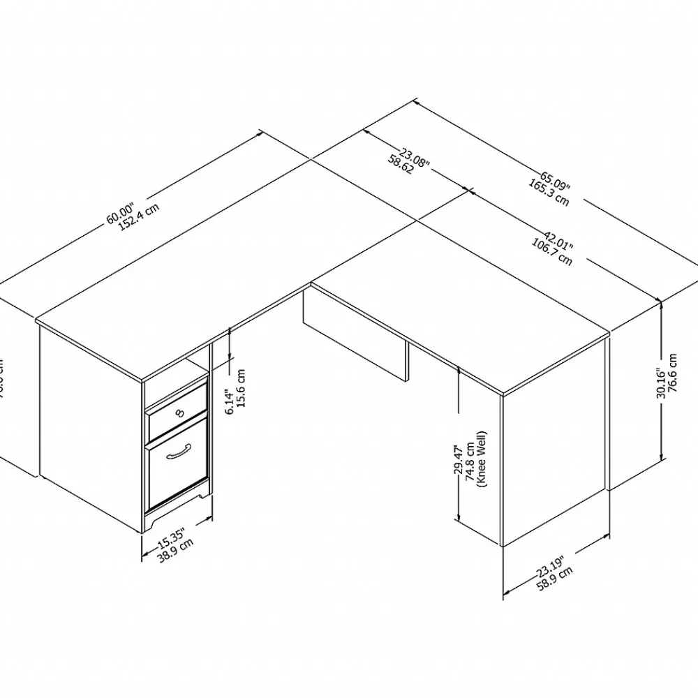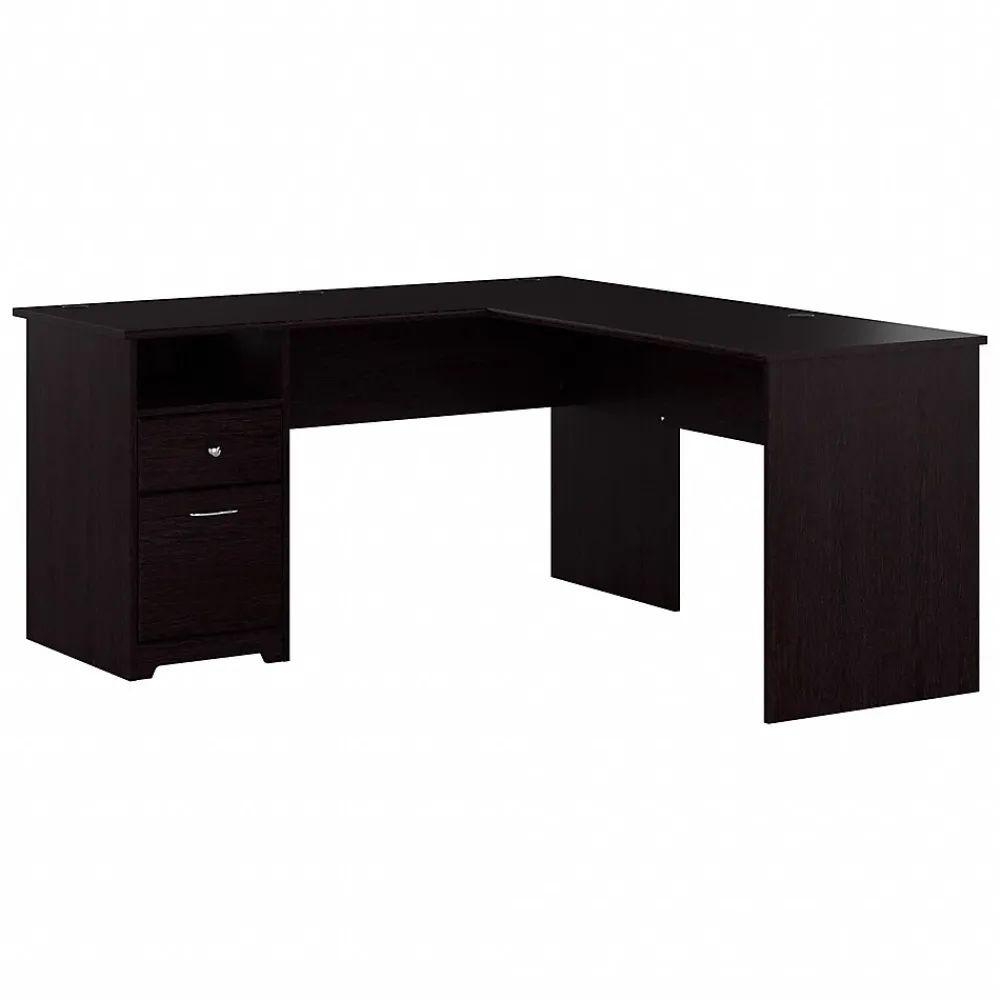 The Bush Furniture Cabot 60W L Shaped Computer Desk with Drawers presents a home office solution with transitional style. Take advantage of the 60-inch L Shaped Desk surface to spread out with a computer and all the materials needed to power through your next project or assignment. The durable desktop supports up to 200 pounds and includes built-in wire management to keep cords and cables out of the way while you work. A single file drawer opens on smooth full-extension ball bearing slides for an effortless reach to letter, legal, and A4-size paperwork. The box drawer organizes writing utensils, notepads, and other small office supplies while the open cubby shelf is perfect for work-in-progress and frequently used materials. This corner desk with storage has been rigorously tested to meet or exceed ANSI/SOHO quality standards for safety and performance and is backed by a 1 Year Warranty.