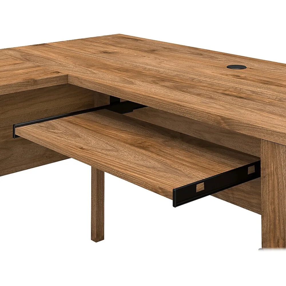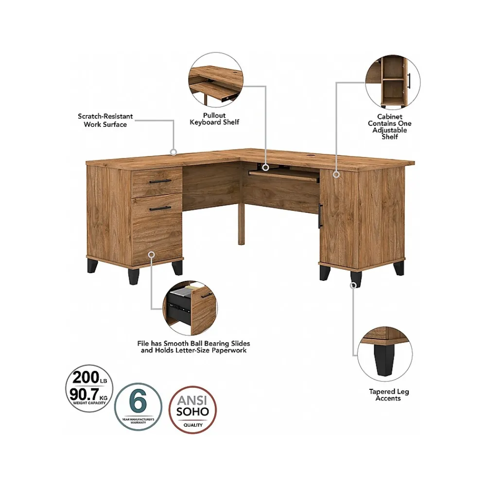 Maximize the potential of your home office with the Bush Furniture Somerset 60″W L-shaped desk with hutch. Create your remote work headquarters with space for a computer, phone, printer, and more. A convenient pullout shelf provides a perfect place to keep a keyboard or laptop, while a storage cabinet and box drawer offer plenty of storage for supplies. A file drawer with ball bearing slides allows for easy access to letter-size documents. Wire management slots help keep cords and cables in order. The hutch features open storage with a large compartment for books or decorations, an adjustable shelf to hold work-in-progress, and two frosted glass doors that provide concealed storage. This home office furniture set is tested to meet ANSI/SOHO standards for safety and performance and is backed by the Bush Furniture 6-year manufacturer limited warranty. American-made with US and imported parts.