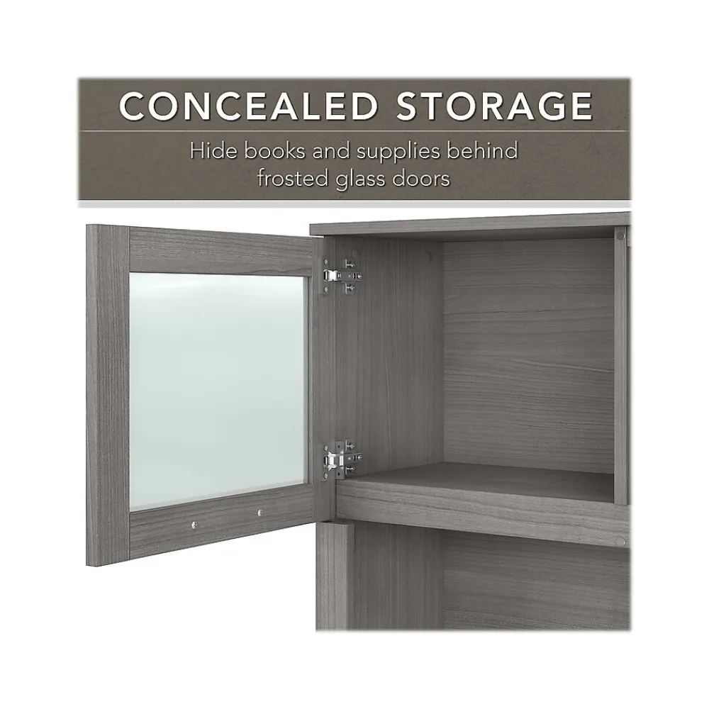 The transitional Bush Furniture Somerset 60″W L-shaped desk with hutch offers a stylish and practical workspace solution for the home or small office. Maximize the potential of your home office with this furniture set. Create your remote work headquarters with space for a computer, phone, printer, and more. A convenient pull-out tray provides a perfect place to keep a keyboard or laptop, while a storage cabinet and box drawer offer plenty of storage for supplies. A file drawer with ball bearing slides allows for easy access to letter-size documents. A wire management grommet helps keep cords and cables in order. The hutch features open storage with a large compartment for books or decorations, an adjustable shelf to hold work in progress, and two frosted glass doors that provide concealed storage. This home office furniture set is tested to meet ANSI/SOHO standards for safety and performance and is backed by the Bush Furniture 6-year manufacturer warranty. American-made with US and imported parts.