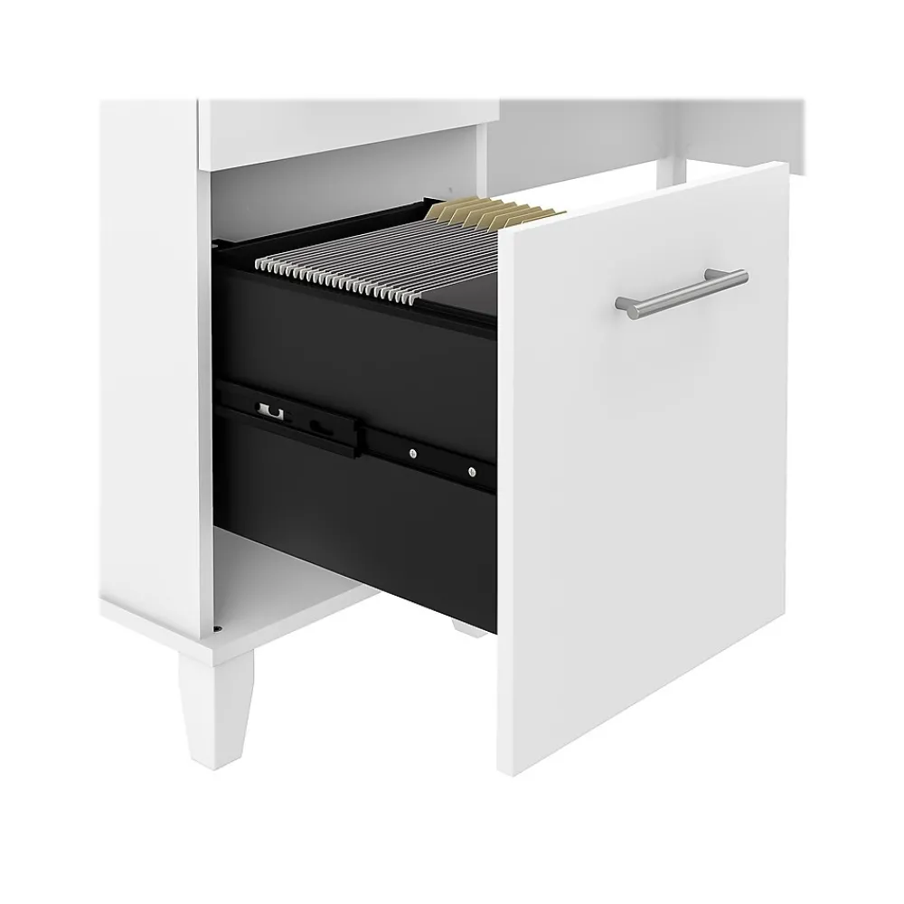 Build your ideal home office around the Bush Furniture Somerset 60″W L-shaped desk featuring transitional style and plenty of storage space for work materials. Maximize the potential of your home office with this L-shaped desk. Create your remote work headquarters with the space for a computer, phone, printer, and more on a surface that features wire management grommets for keeping cords and cables in order. A convenient pullout tray provides a perfect place to keep a keyboard or laptop, and the desk also includes a vertical storage cabinet with an adjustable shelf. Place pens, paper, and more in the box drawer, and enjoy a file drawer gliding on smooth ball bearing slides for an easy reach to documents. The desk in transitional styling offers an elegant finish with tapered legs and contemporary metal hardware for an alluring appearance. This L-shaped desk with storage is tested to meet ANSI/SOHO standards for safety and performance and is backed by the Bush Furniture 6-year manufacturer limited warranty. American-made with US and imported parts.