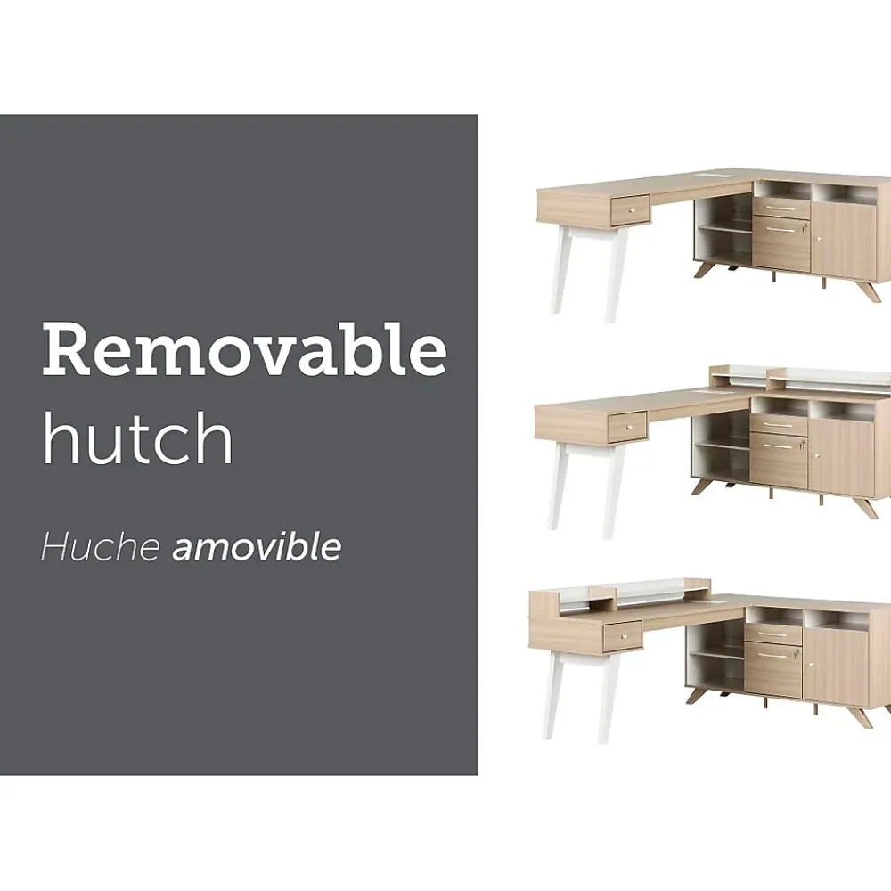 - Removable hutch with two open spaces for storage is easy to place on or take off the surface of this L-shaped desk; no need to screw it on: just set it on the rubber pads
