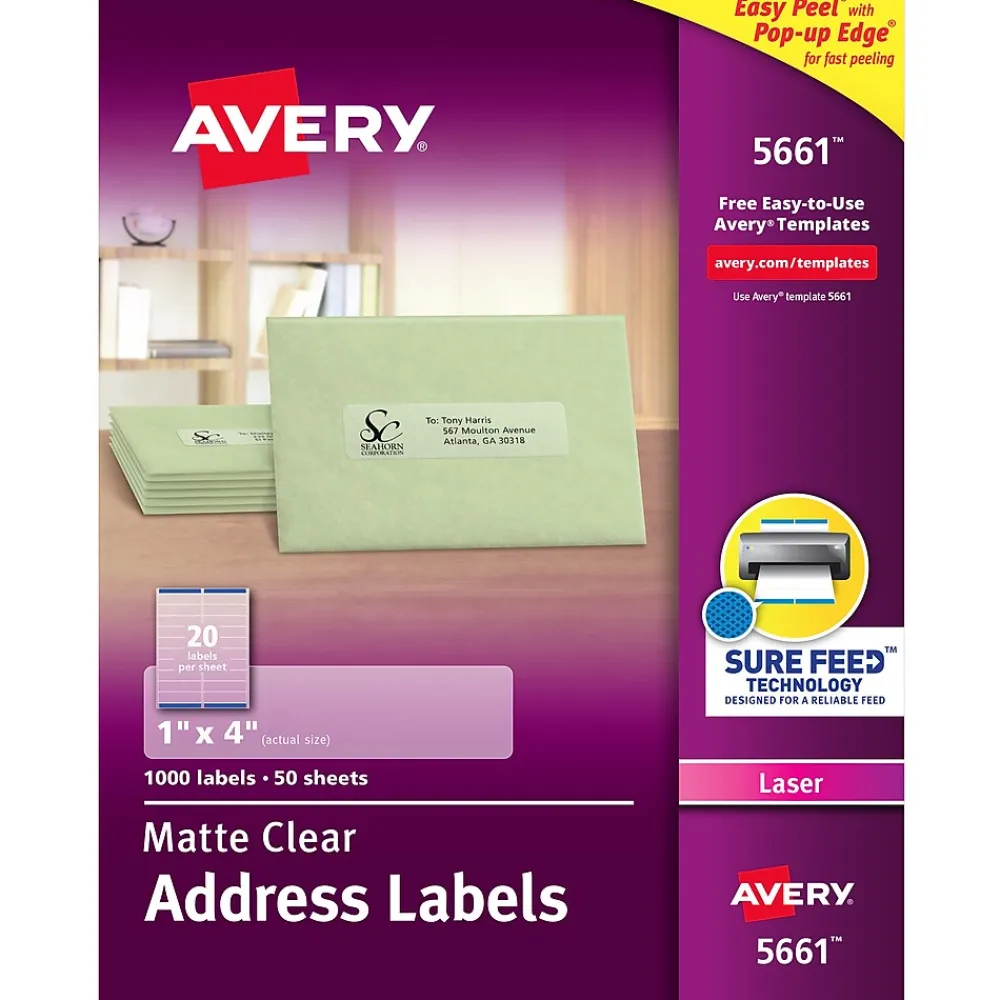 Do your packages and envelopes need a shot of sophistication? This pack of Avery(R) matte clear address labels is the clear choice for sprucing up ordinary packaging and mailing. These matte clear labels basically disappear when applied to white, light-colored or textured paper. Use these clear labels on vellum envelopes and glassine bags to create a printed-on appearance. These labels also feature exclusive Avery(R) Sure Feed(R) technology to improve print alignment and avoid jamming. The blue, textured strip on the top of each sheet provides better grip for printer rollers and helps feed the sheet through your printer.