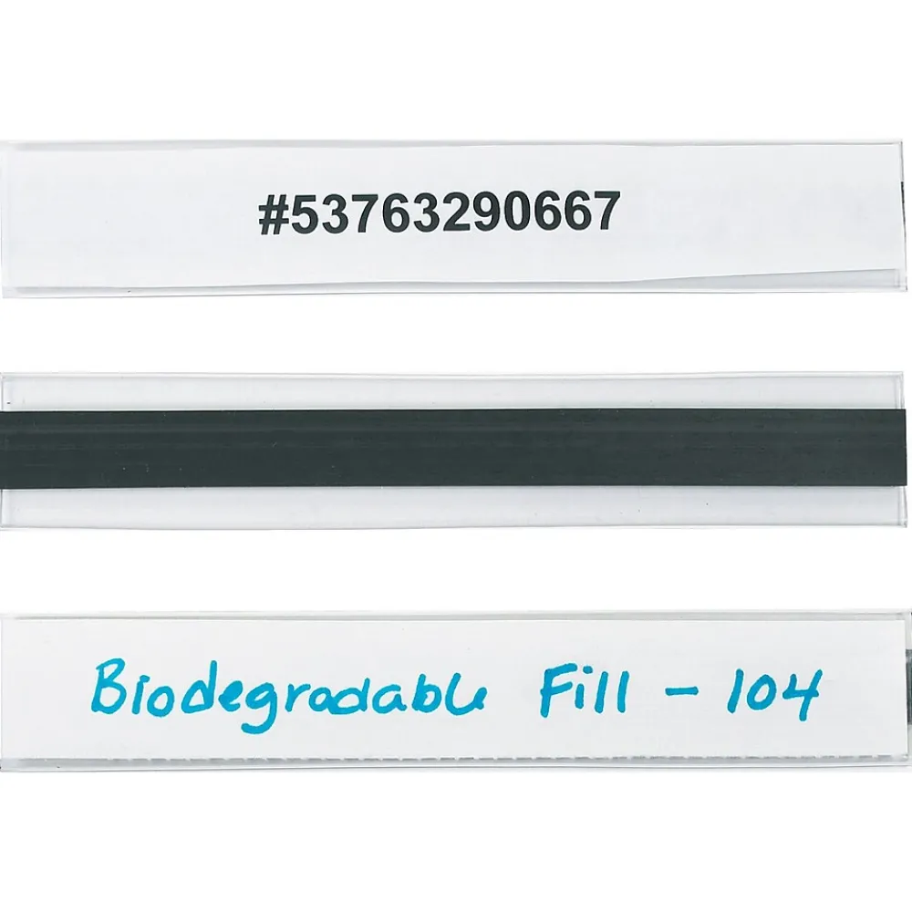 1″ x 6″ Hol-Dex® Magnetic Plastic Label Holders. Insertable for quick and cost effective product ID changes. Ideal for organizing shelves, racks, bins and drawers. Features a clear plastic, side-load design. Magnetic holders are repositionable on metal surfaces. White inserts included.
