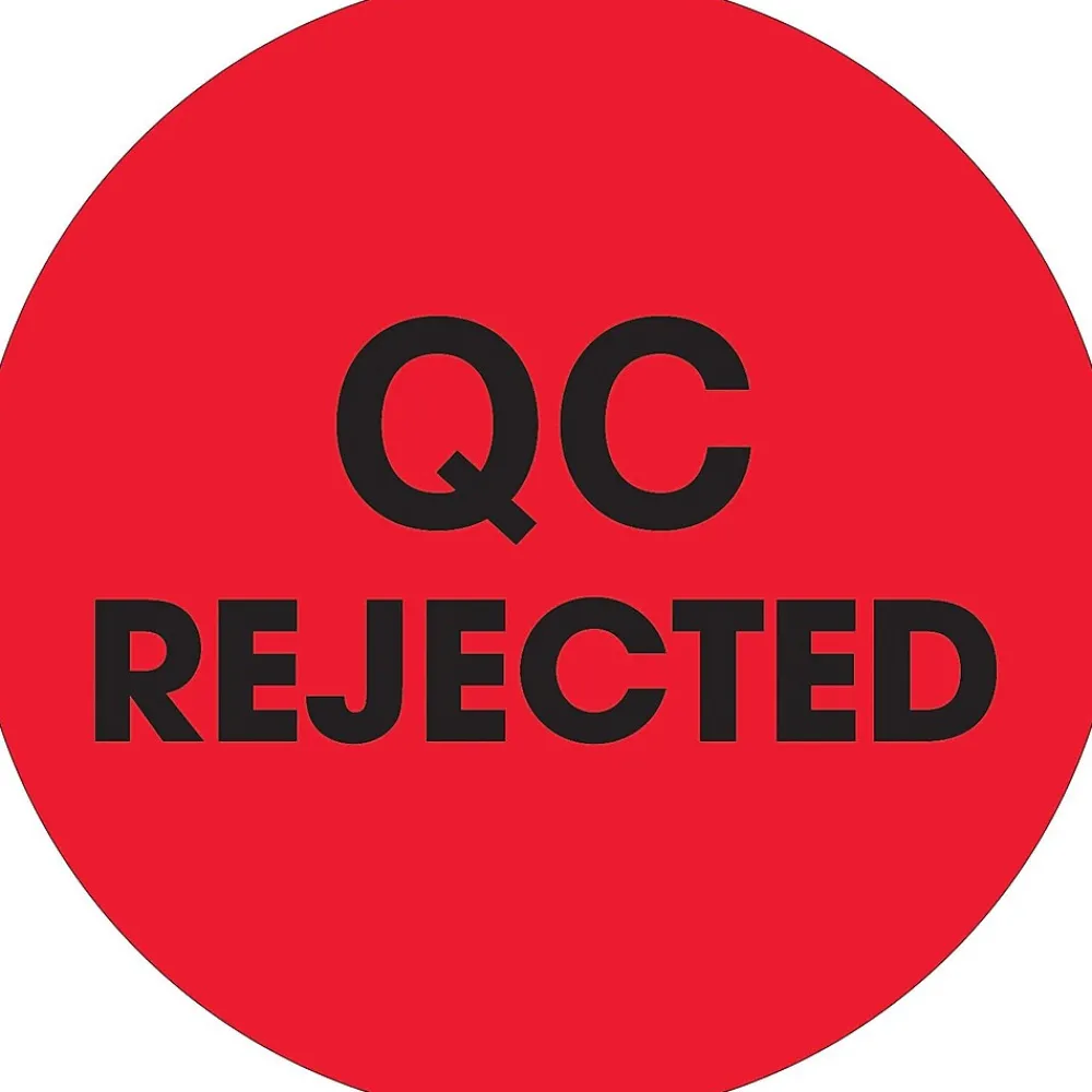 Tape Logicâ„¢ 2″ “QC Rejected” Labelin fluorescent red color is printed with black color text. Label in circular shape has pressure sensitive adhesive for quick attachment on any surface, sold as 500 per roll.