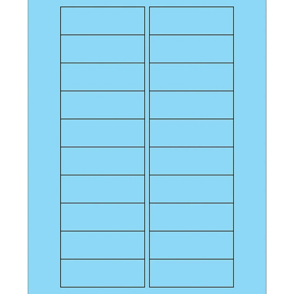 3 x 1″ Fluorescent Pastel Blue Rectangle Laser Labels. Use to create your own product or mailing labels. Labels work with both laser and ink jet printers. Permanent adhesive. Labels stick to a variety of smooth surfaces including paper, corrugated, plastic, wood, glass and metal.