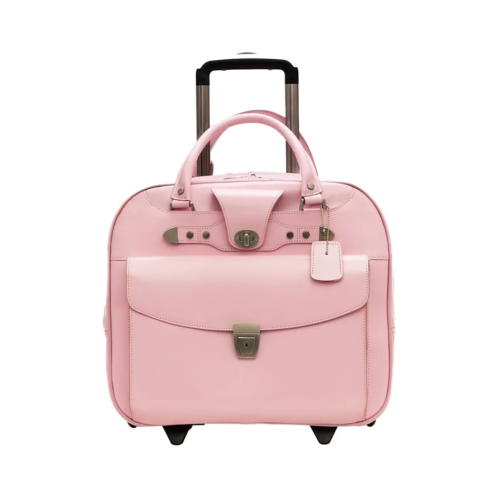 The McKlein DENALI wheeled briefcase features a quick-access front pocket secured by a key lock and containing an organizer for business cards, pens, and accessories. A small front pocket is secured by a flap with turn lock, while a built-in high-density laptop compartment protects laptops up to 15″ in size. The case also offers three slip pockets for power cords, media devices and accessories, and a double compartment divided by an accordion expandable file for important documents. A smart strap allows for easy transport on extended handles of other rolling cases and luggage.