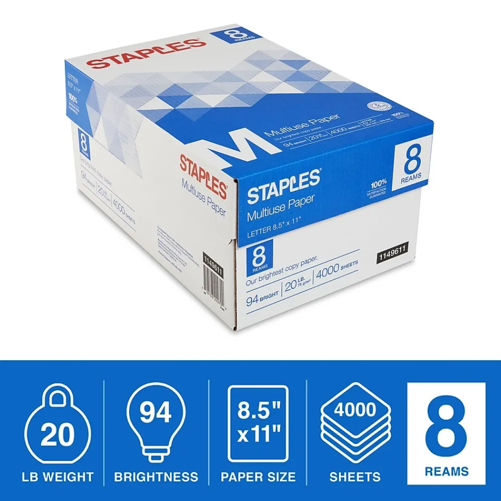 Produce multiple copies or stacks of documents with this eight-ream case of Staples multiuse copy paper. The acid-free construction keeps each sheet looking like new for longer, and the 20-pound paper weight is ideal for everyday printing tasks. Featuring ColorLok technology, this Staples multiuse copy paper brings out the best in monochrome or color prints to give your paperwork a professional look.