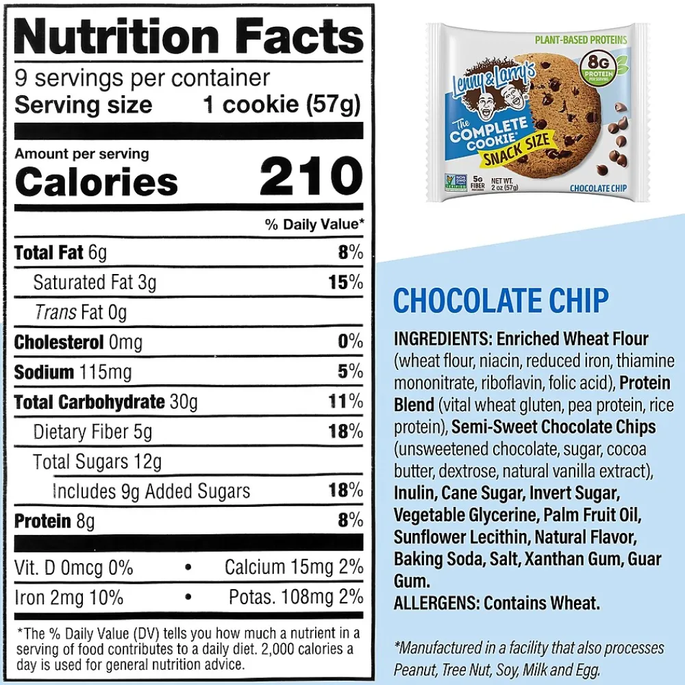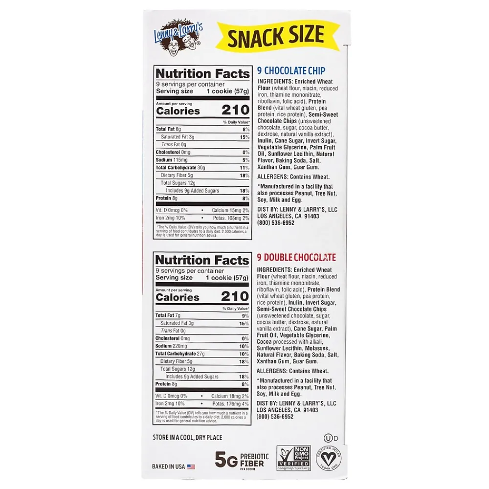 - 18 inividully wrapped cookies, 9 chocolate chip and 9 double chocolate