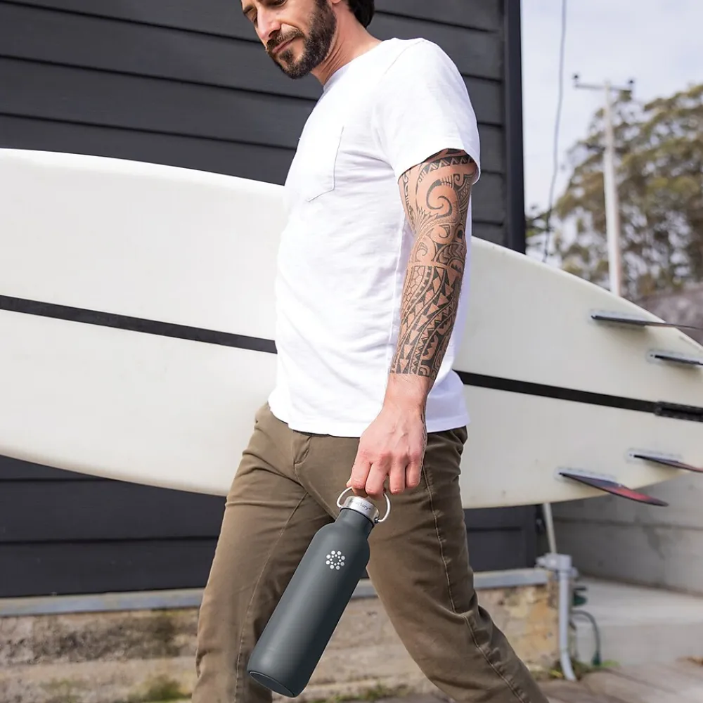 Stay hydrated in style! The Lifefactory Carbon 32-Oz. Sport Bottle pairs superior vacuum insulation with an insulated cap to keep drinks warm or cold. The durable, powder-coated stainless steel is easy to grip while making it ideal for everything from outdoor hikes to yoga at home.
