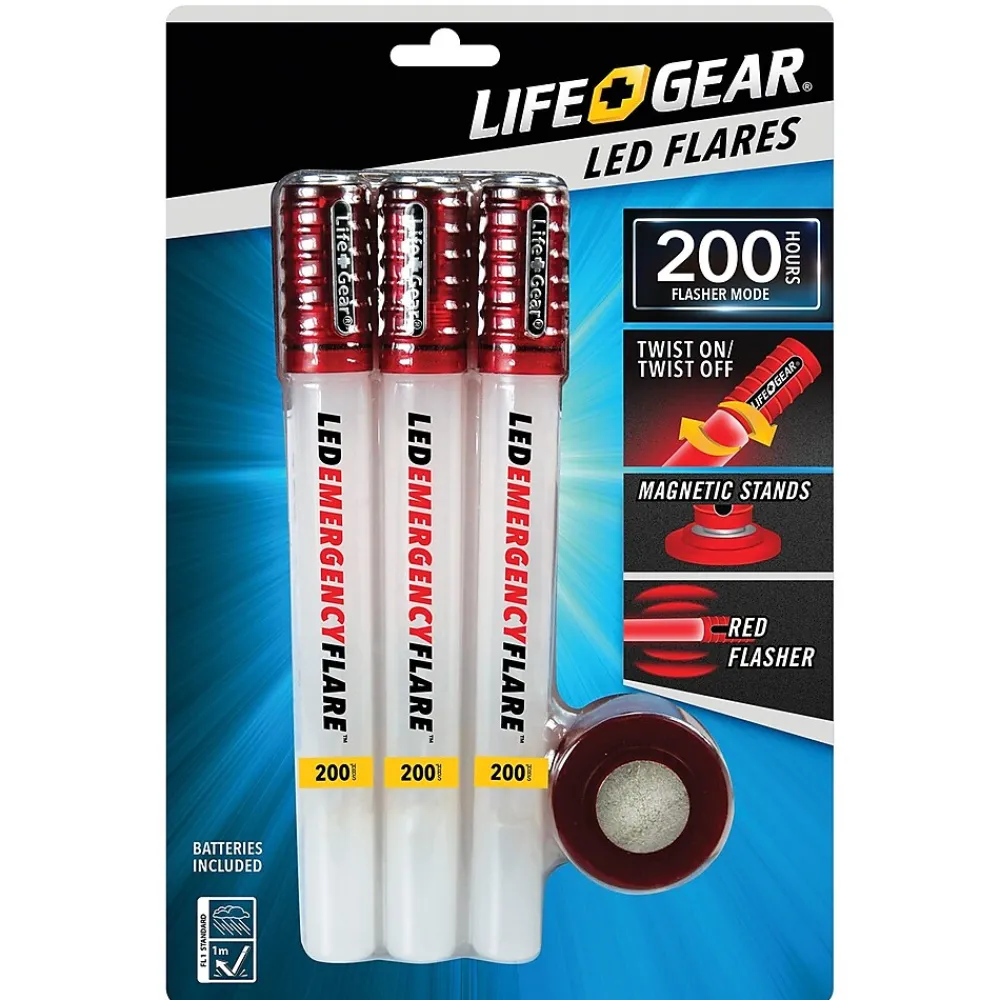 If your vehicle breaks down, you have to change a tire, or you need to let other drivers know that debris is in the road, emergency road flares are excellent items to have on hand. The Life+Gear 3-Pack LED Emergency Flares are long lasting LED signaling lights. They contain no chemicals or flammable materials and are much safer than incendiary flares. Advanced LED technology makes these lights reusable with up to 150 hours of battery life in flash mode. They are also simple to use. Just twist on for solid red, and turn off and twist again for a blinking red light. The flares have a magnetic base which can be attached to the metal body of your car or attached to the included base stand, creating a visible, long-lasting emergency signal. In addition, these flares are water-resistant, float in water, and button cell batteries are included.