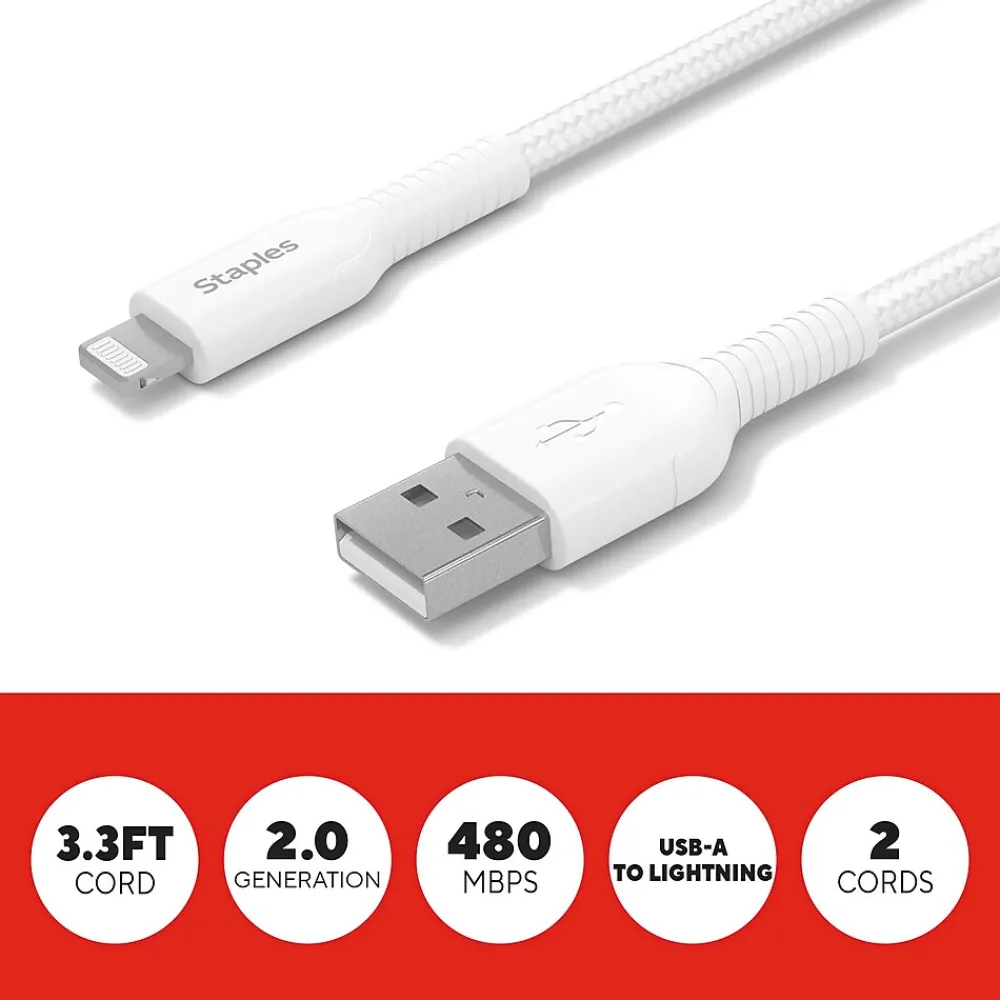 Power your smartphones or tablets with this 2-pack of StaplesĀ® USB-A to Lightning Braided Cables. The unique braided design of these charging cables provides extra durability, prevents tangles and has been tested to withstand up to five-thousand bends. A 3.3ft (1m) cable length is compact enough to prevent messy cords and is easy to take with you on the go.