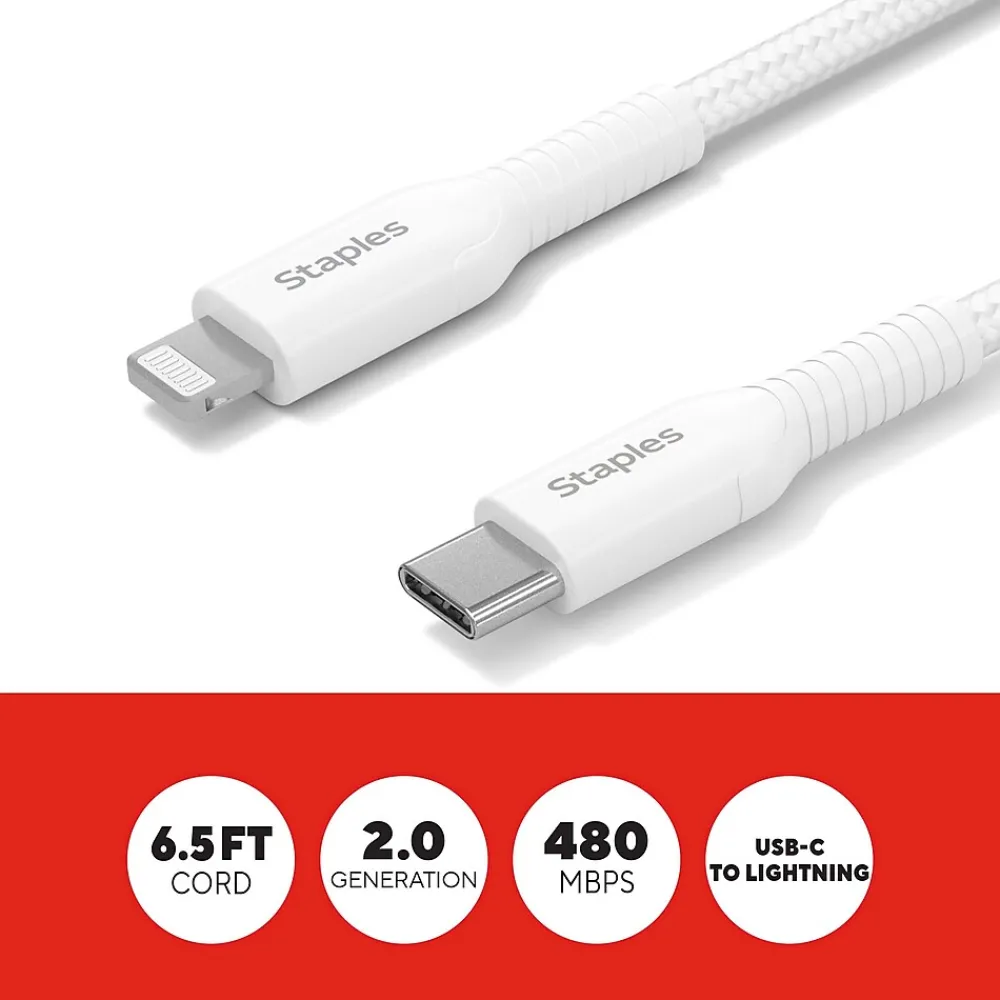 Power your Apple devices (Generation 14 and earlier) with this lasting StaplesĀ® USB-C to Lightning Braided Cable. The unique braided design provides extra durability, prevents tangles and has been tested to withstand up to five-thousand bends. A 6.5ft (2m) cable length gives extra reach when needed and is perfect for comfortably using devices while they charge.