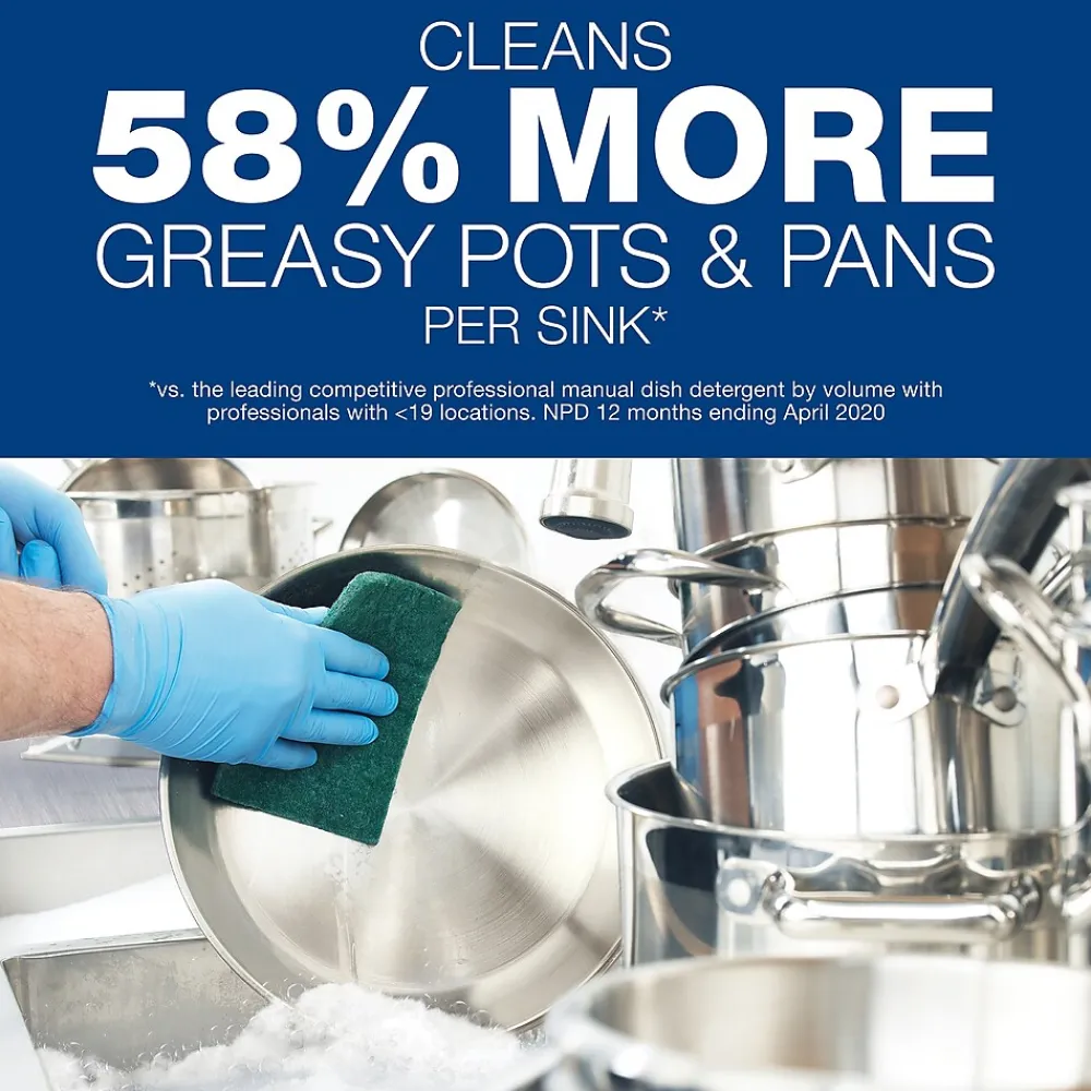 - Dishwashing detergent with long-lasting suds cleans 58% more pots and pans per sink* (*vs. the leading competitive professional manual dish detergent by volume with professionals with less than 19 locations. NPD 12 months ending April 2020)