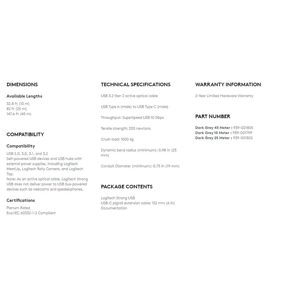 With up to 15x the reach of ordinary USB 3.x cables, Logitech Strong USB lets you separate USB peripherals and a host PC by up to 45 meters (147.6 ft). These active optical cables are plenum-rated and ECA certified for commercial installation in walls, above ceilings, through raceways, and within standard ¾” conduit