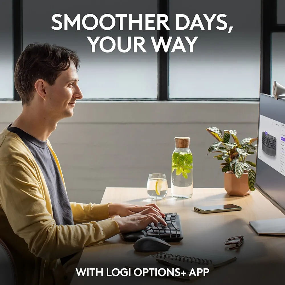 Discover this Logitech feel-good wireless combo, with an intuitive ergonomic keyboard and mouse sculpted for day-long comfort and productivity. Typing feels instantly familiar on Wave Keys’ wavy key frame design. A cushioned palm rest lifts pressure and improves wrist support. Meanwhile, the Signature M550 L’s contoured shape and rubber side grip keep medium- to large-size hands comfy throughout the day. Both devices have been made with recycled plastic, have a long battery life, and connect easily using Bluetooth or the included Logi Bolt receiver.